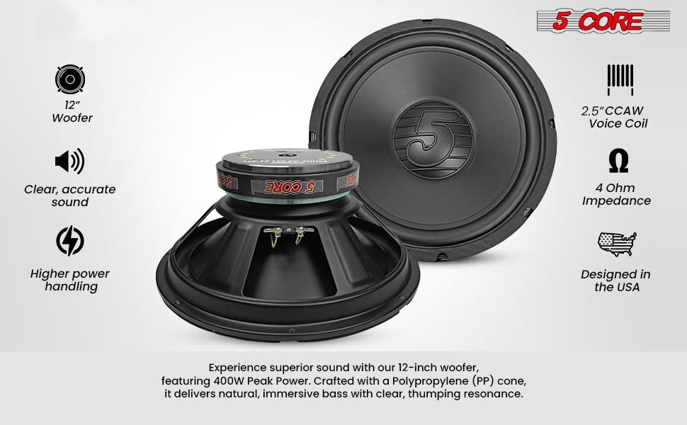 5 Core 12 Inch Woofer Pair 400W Car Audio Subwoofer 4 Ohm Impedance Replacement Deep Bass Sub W 50 Oz Y30 Magnet Poly Cone Rubber Surround For Vehicle Sound System - WF 12 156 PP 4OHM 2PCS