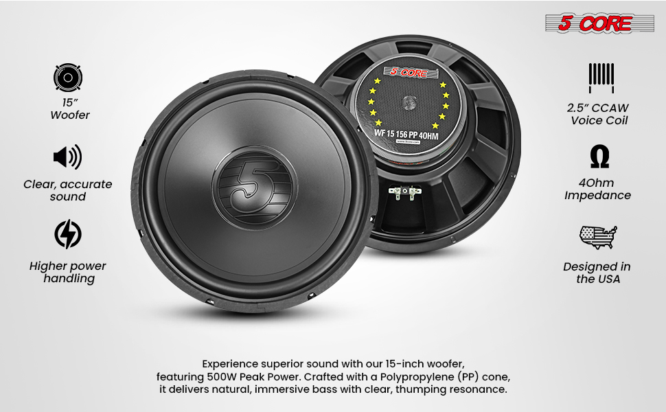 5 Core 15 Inch Woofer 500W Car Audio Subwoofer 4 Ohm Impedance Replacement Deep Bass Sub W 60 Oz Y30 Magnet Poly Cone Rubber Surround For Vehicle Sound System - WF 15 156 PP 4OHM