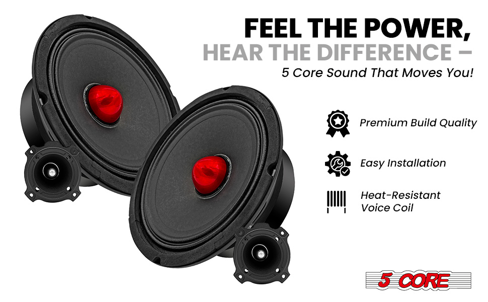 High-Performance Mid Range speaker 140W RMS & bullet tweeter 200W RMS combo for high fidelity audio. 5 Inch CCAW voice coil in speaker & aluminum diaphragm in tweeter enhance stability & performance. Wide 2KHz-20KHz tweeter frequency complement the speaker's audio output for a full audio experience. 30 Oz Magnet in the 6.5"" speaker for precise & powerful sound reproduction delivers rich, deep bass. 8 Ohm Speaker Impedance and 4 Ohm in tweeter for compatibility & easy integration with audio setups.