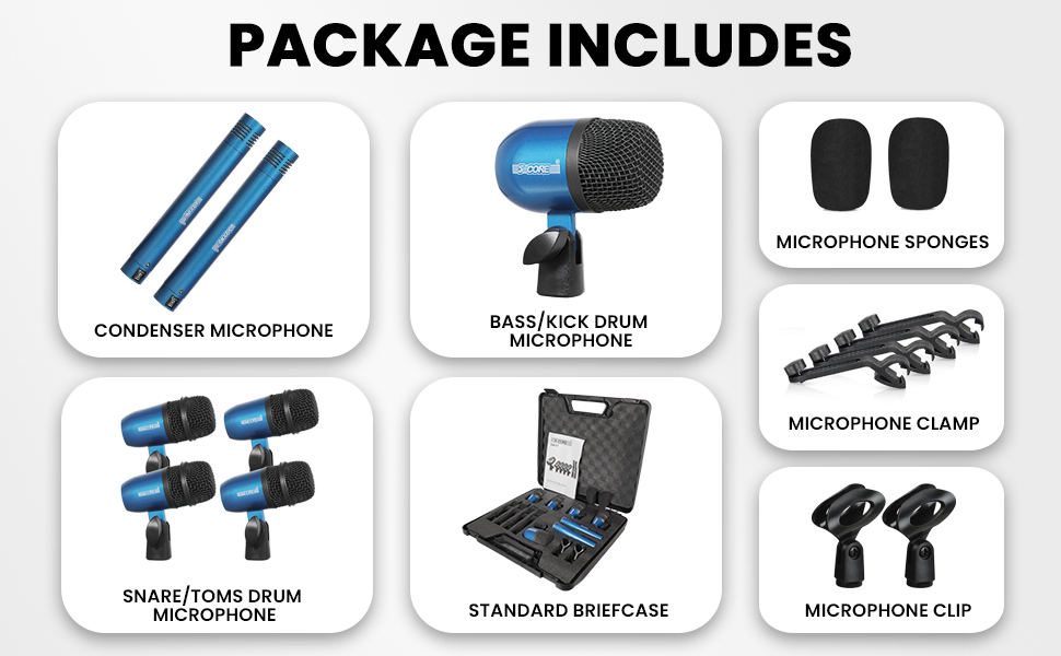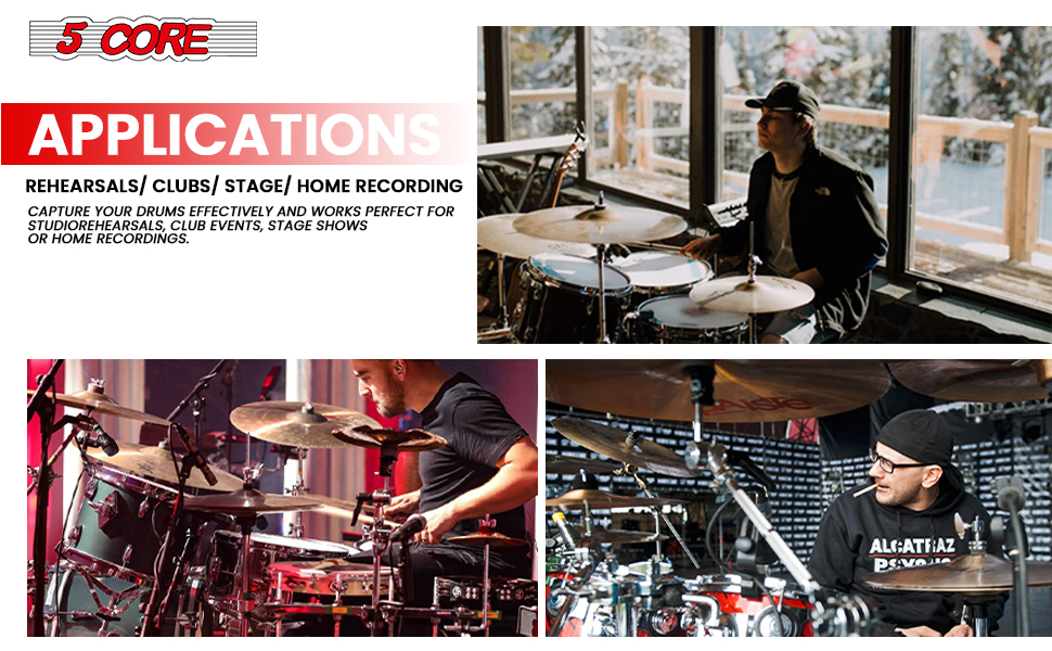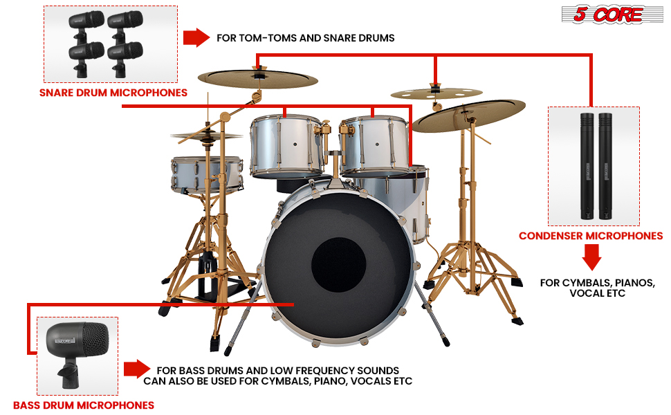 5 Core Drum Microphone Kit 7Pc All Metal Drummer Mics Tom/Snare & Cymbals Wired Instrument Drums Set