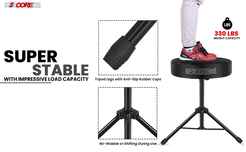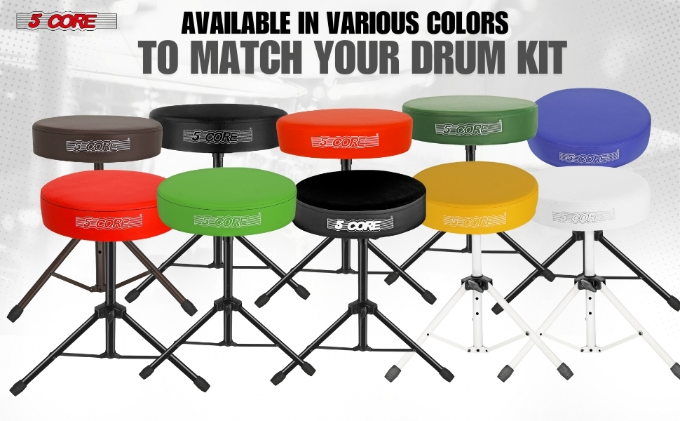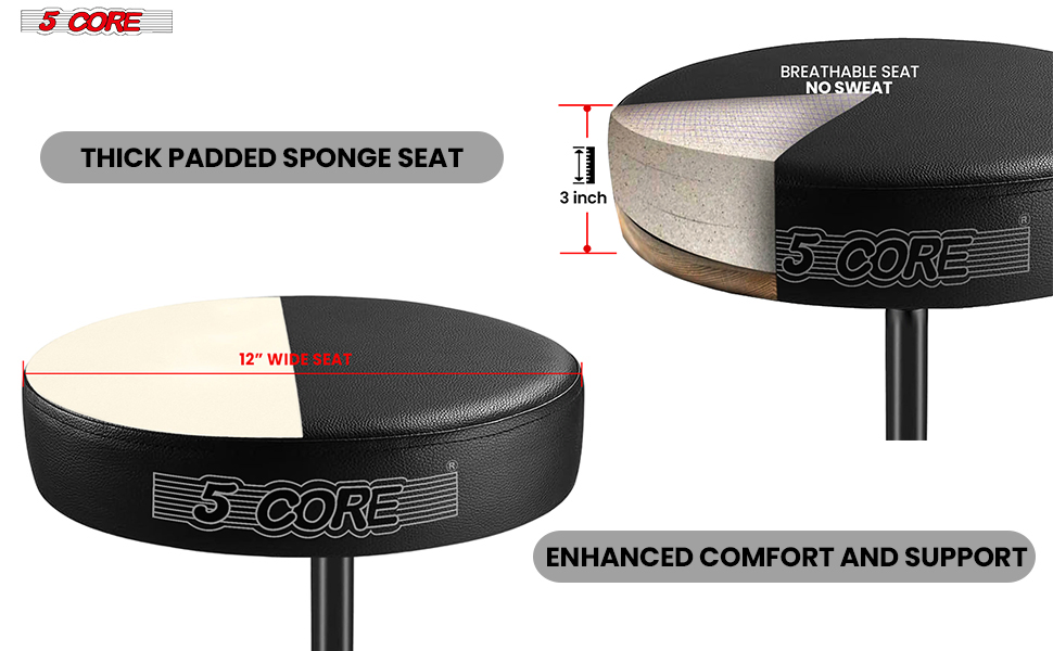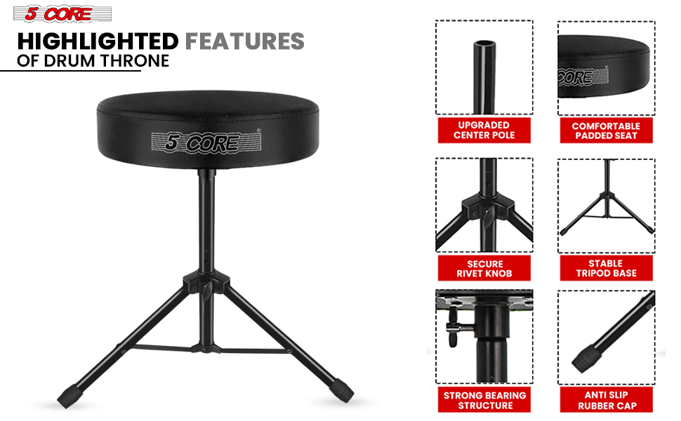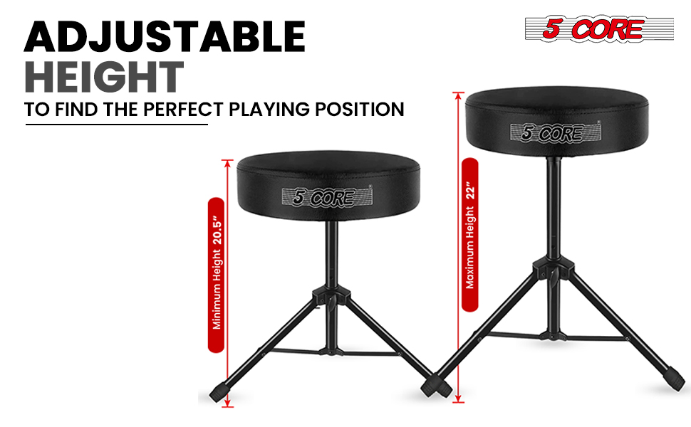 Experience unmatched performance with the 5 Core drum throne. Its 3 inch thick, 12 inch wide padded seat provides lasting comfort for long drumming sessions. This adjustable drum throne seat ranges from 20.5 to 22 inch, ensuring perfect playing position. The professional drum throne supports up to 330 lbs, making it ideal for both adults and kids.