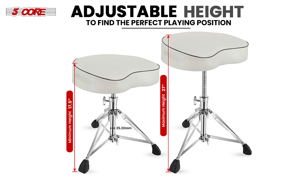 Experience amazing comfort with our thick padded drum throne, featuring a 4 inch high-density soft sponge seat in back and 3.5 inch in front. The swivel height adjustable mechanism lets you rotate the seat 360 degrees. Adapts easily to different drumming setups and techniques. Height can also be changed from 17.5 to 27 inches, accommodating both adults and kids and supporting up to 441 lbs.