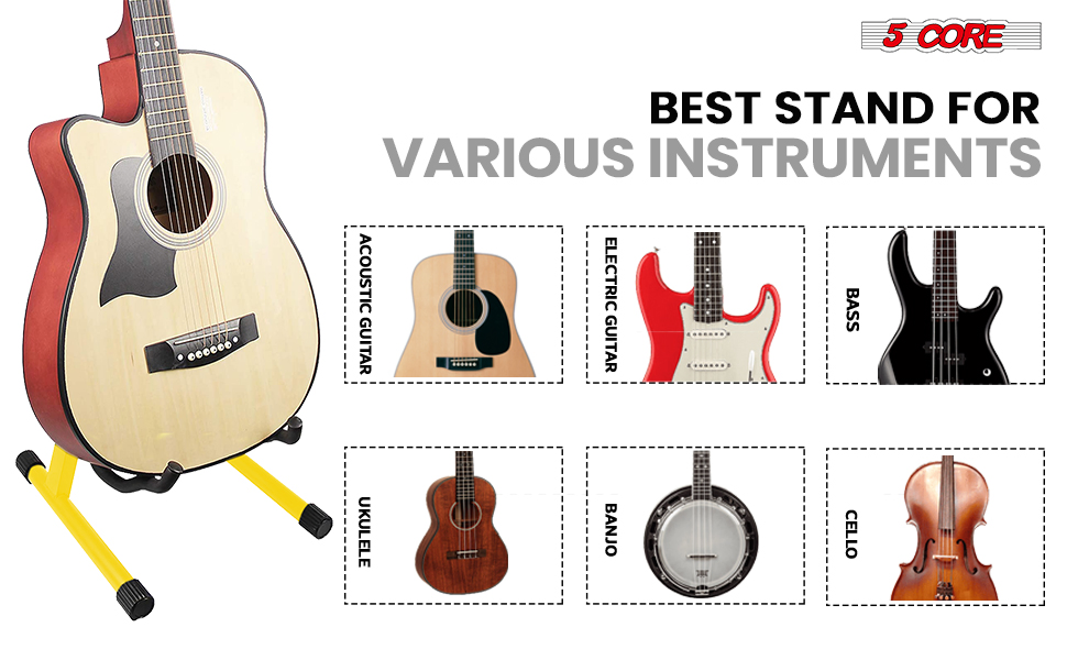 This heavy-duty A frame metal guitar stand floor offers unmatched stability and durability with its thick steel construction and reinforced welded joints. Adjustable to fit acoustic, electric, ukulele, and bass guitars, this guitar support features soft padding to protect against scratches and dents.