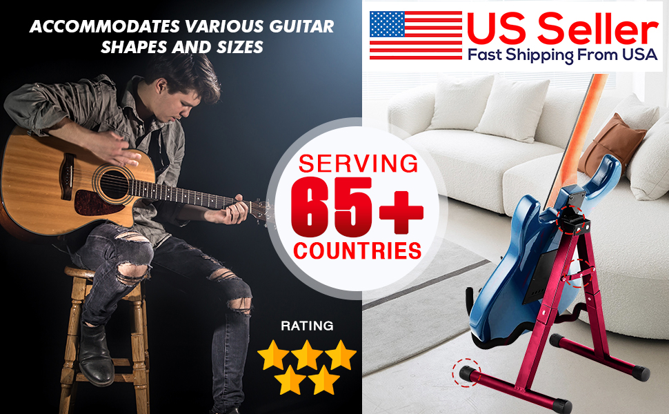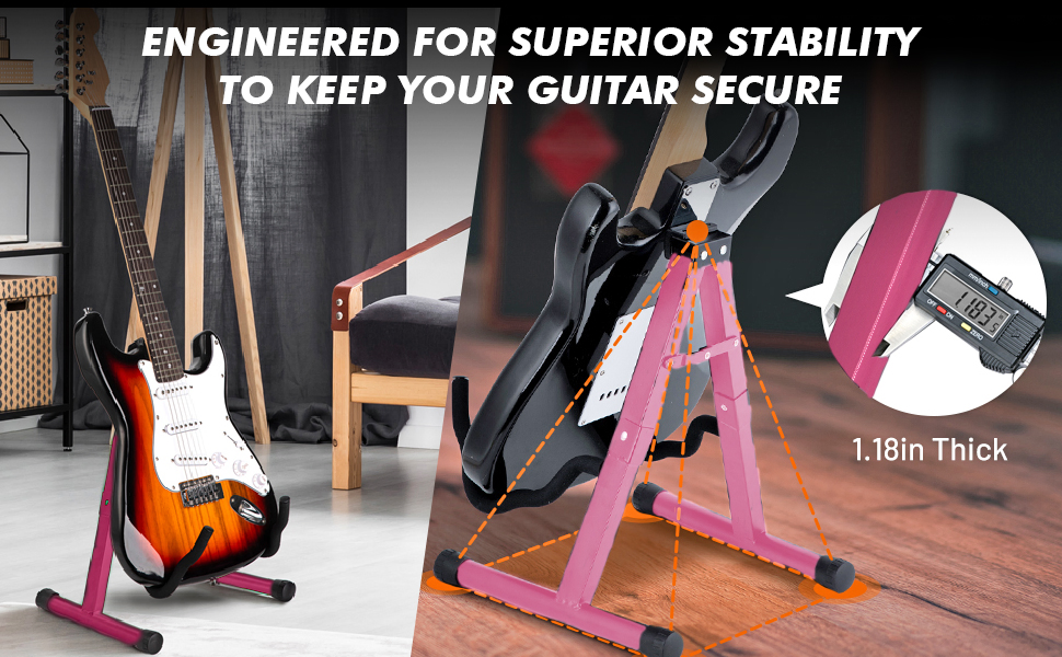 This heavy-duty A frame metal guitar stand floor offers unmatched stability and durability with its thick steel construction and reinforced welded joints. Adjustable to fit acoustic, electric, ukulele, and bass guitars, this guitar support features soft padding to protect against scratches and dents.