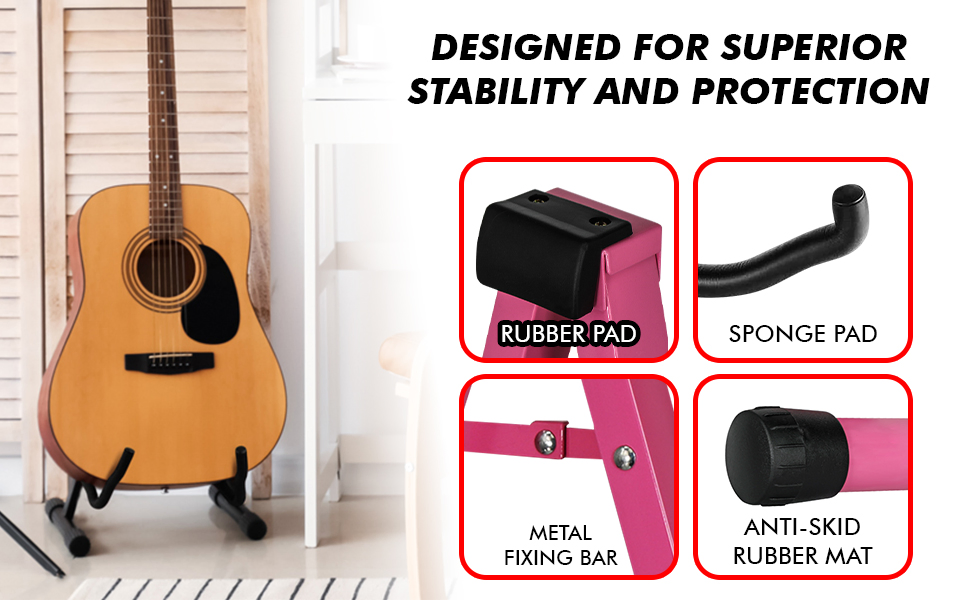Built from heavy duty metal to be sturdy and stable, our stand securely holds your guitar without tipping over. It’s designed to last.