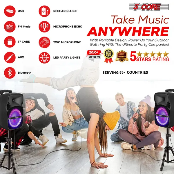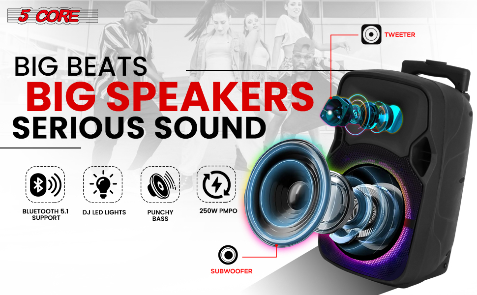 5 Core Party Speaker Bluetooth 250W Big Monster Powered Rechargeable Outdoor PA DJ System W Disco Lights 2 Wireless Karaoke Mics Portable Rolling Speakers W Handle Black - ACTIVE HOME 8 2-MIC