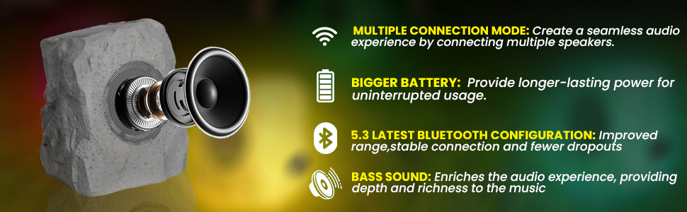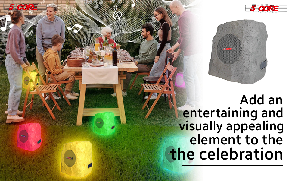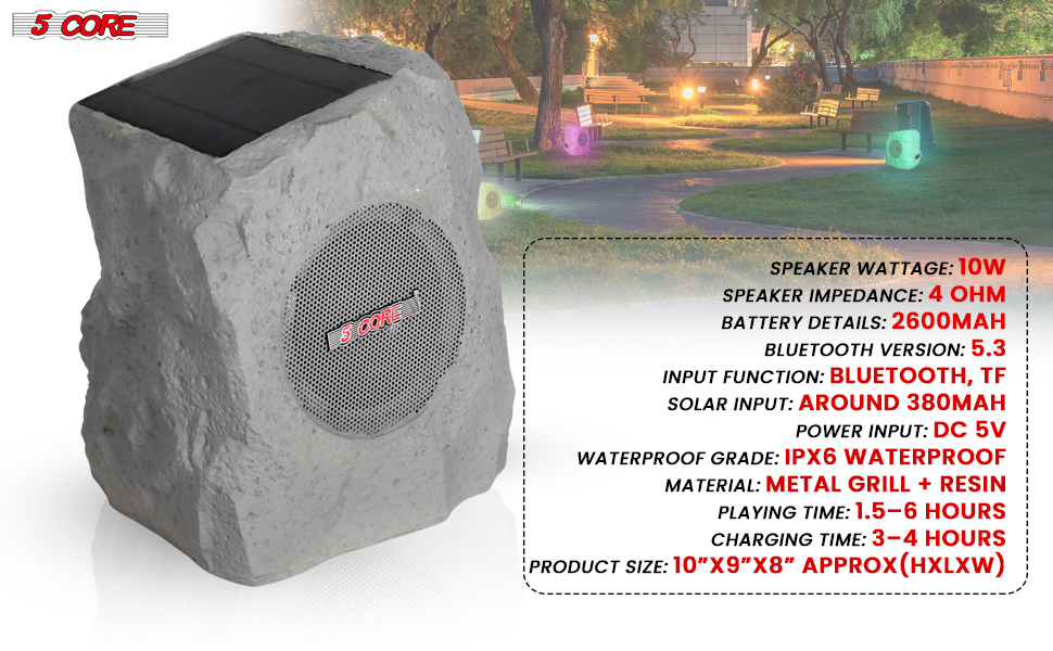 5 Core Rock Speaker Outdoor Waterproof Bluetooth Garden Speakers Solar & USB Charging RGB Colors For Patio Pool & Home