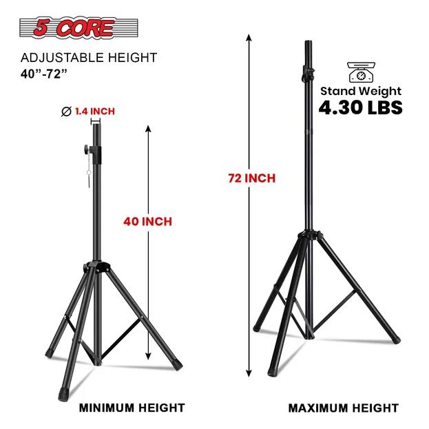 5 Core Speaker Stand Tripod Floor Tall Adjustable Up To 72 Inch DJ Studio Monitor Stands Pole Mount
