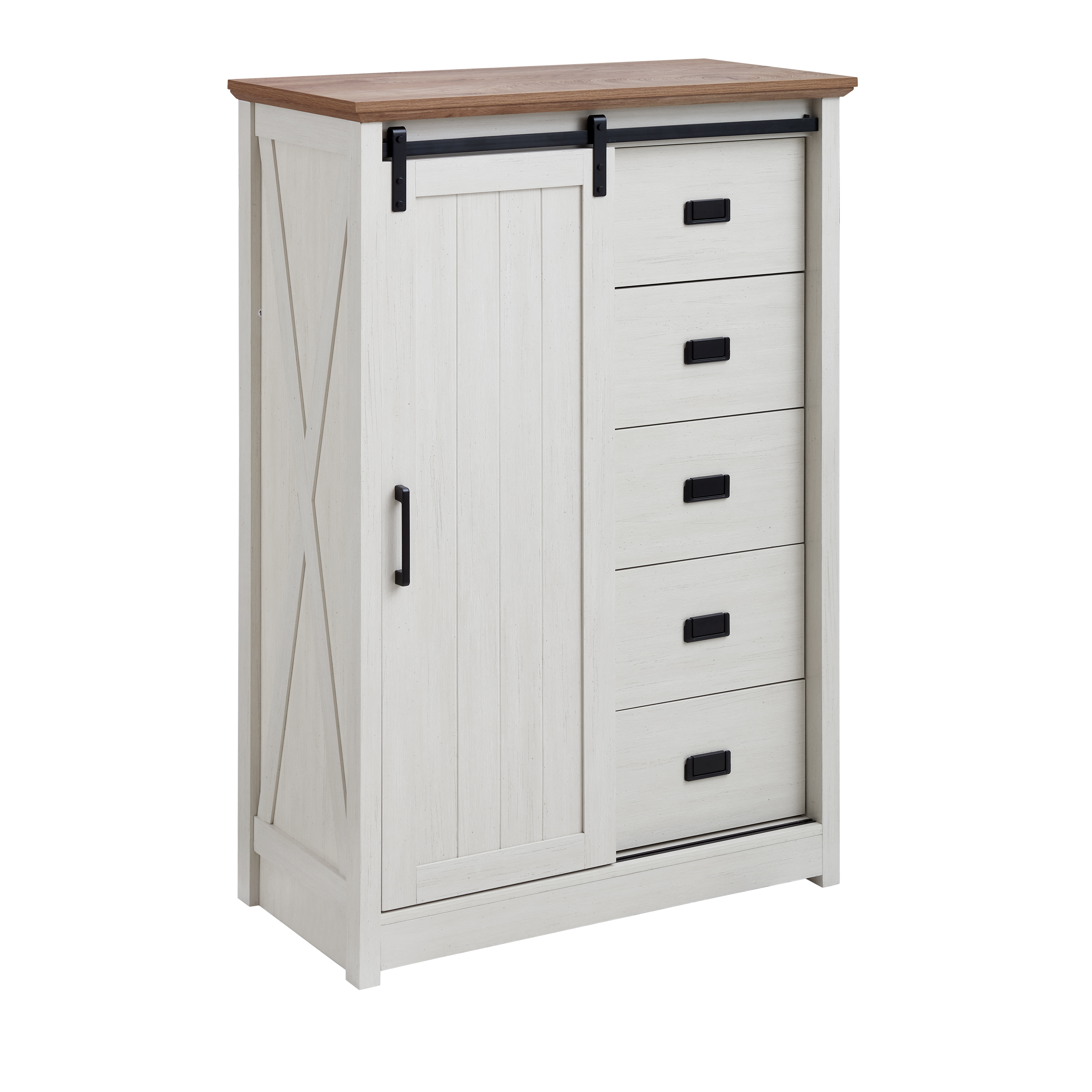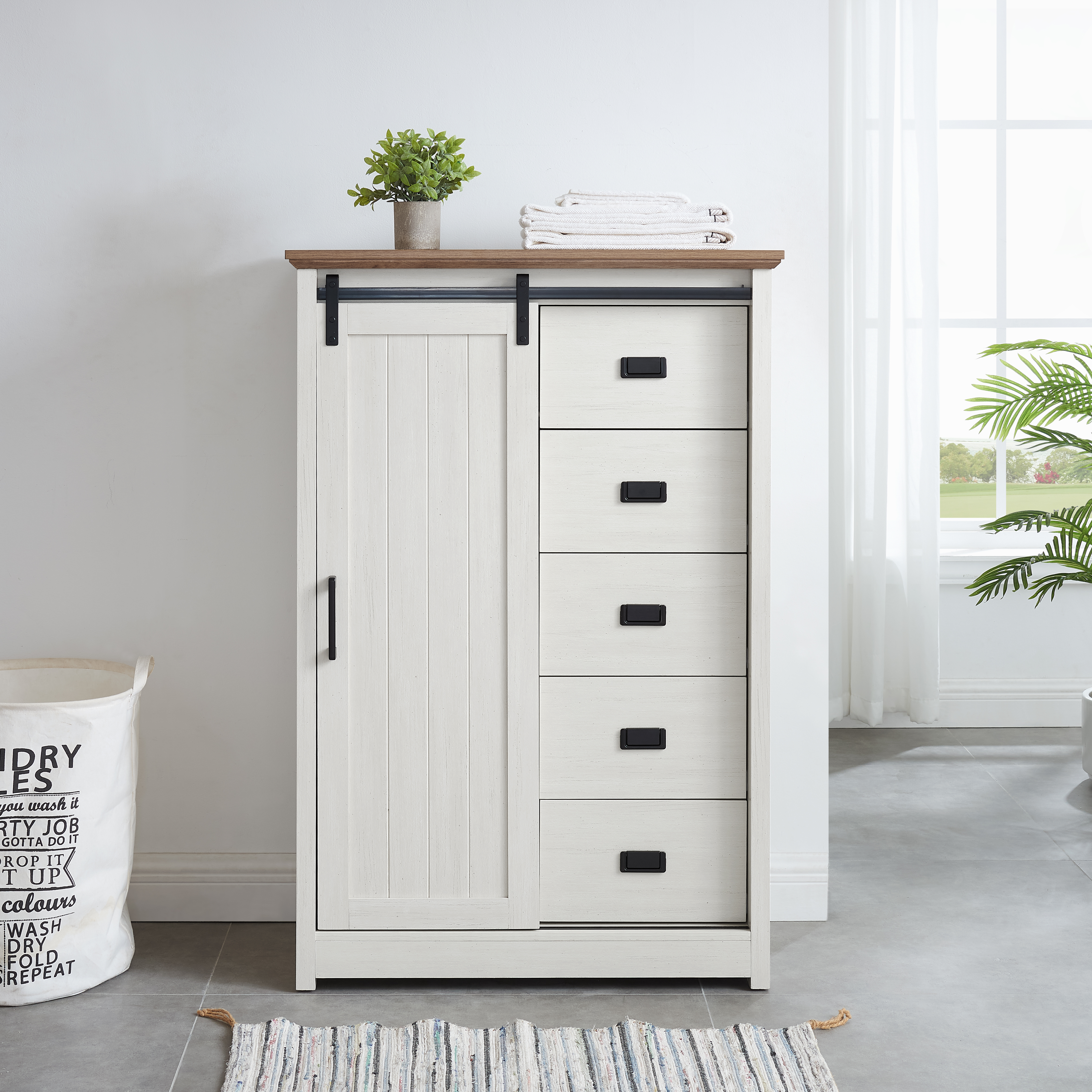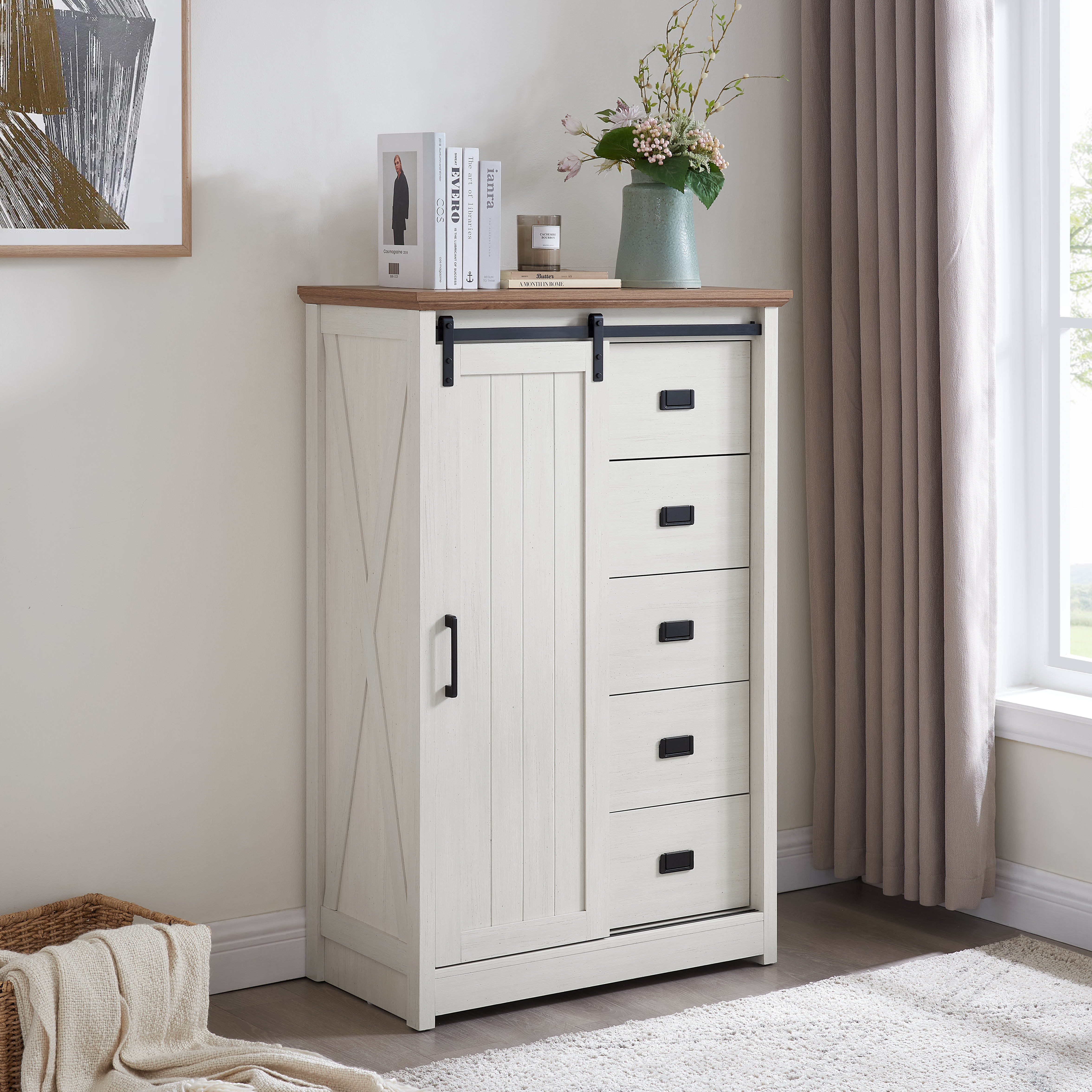 Product Name:5 Drawers Dresser w/Sliding Barn Door, Farmhouse Modern Tall Dresser 5 Chest of Drawers, Storage Organizer Dresser for Bedroom, Hallway, Living Room, Kids Room WHITE