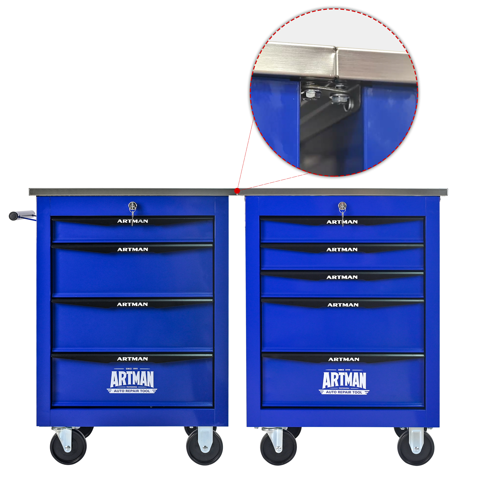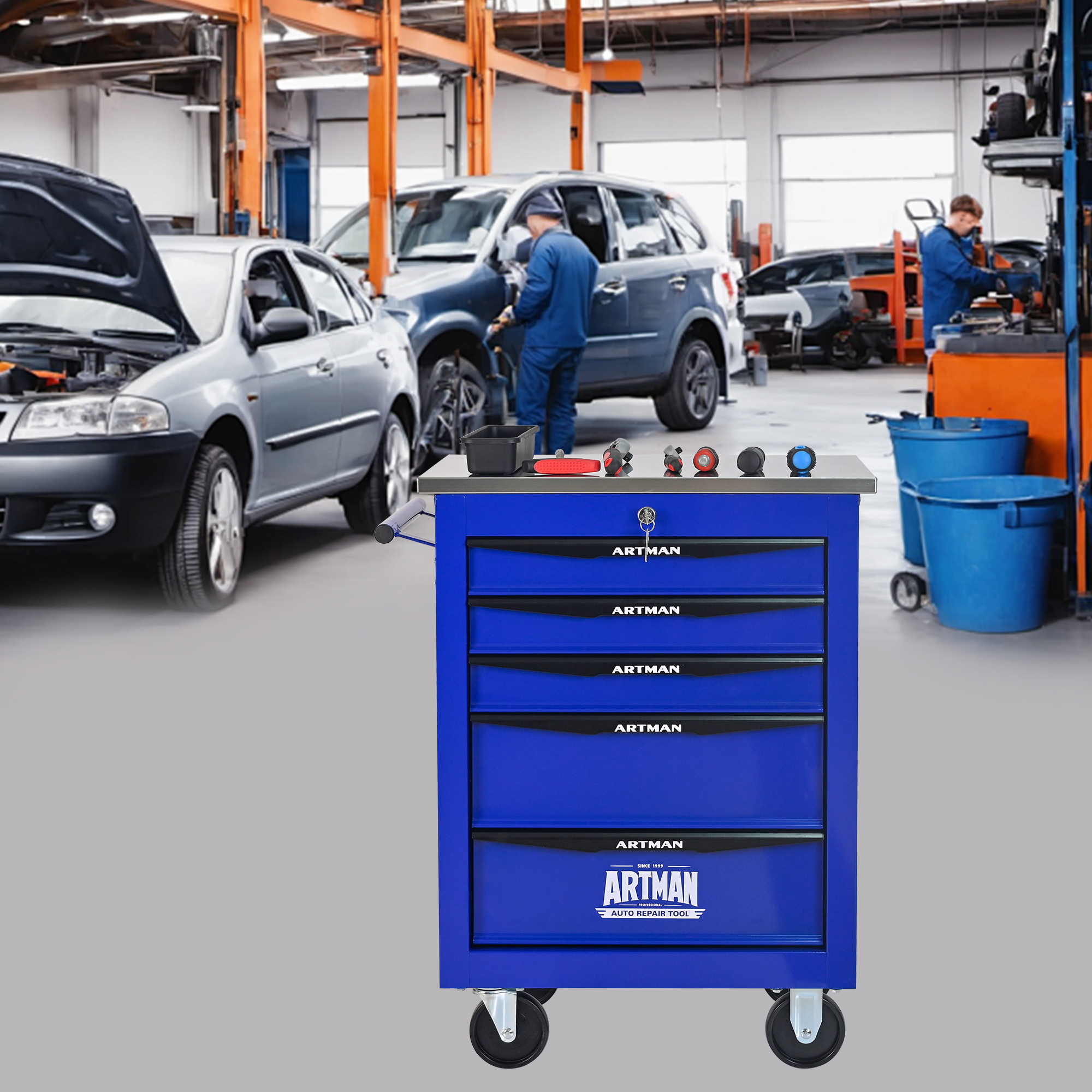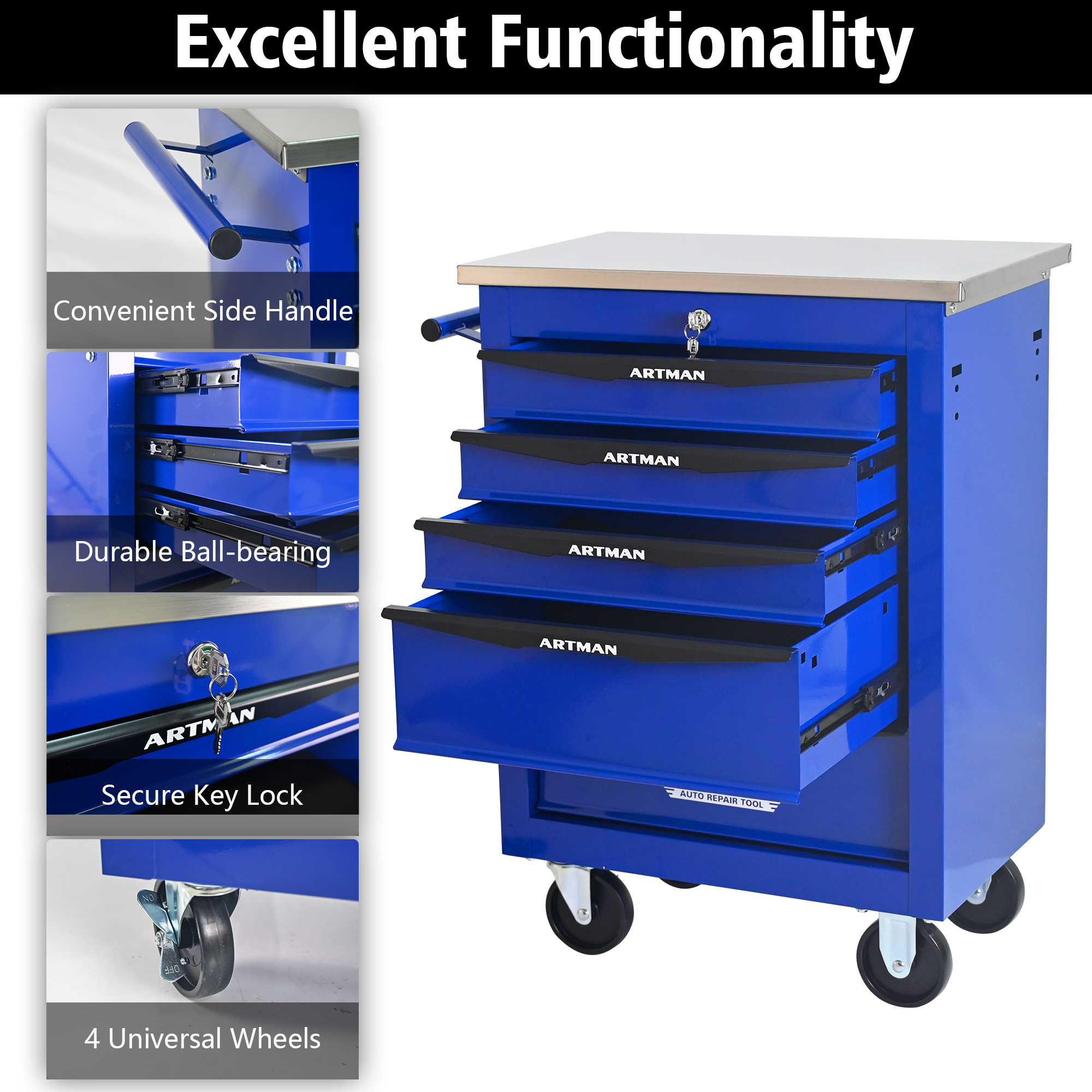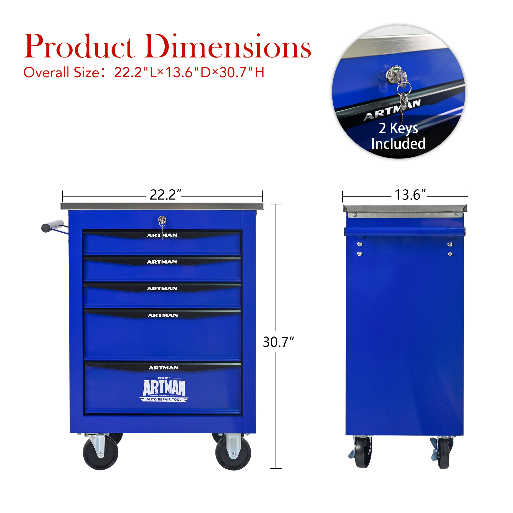 Product Name:5 Drawers Multifunctional Tool Cart with Wheels,Metal Rolling Tool Cart Storage for Garage Workshop Warehouse Repair Shop--With Stainless Steel Roof- BLACK&BLUE
