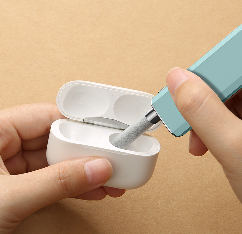 1. Multifunctional cleaning kit: Flocking sponge can clean the dust in the wireless charging box of the earphone, and the high-density brush can clean the dirt in the sound hole/keyboard of the earphone. And the metal tip can clean stubborn dust