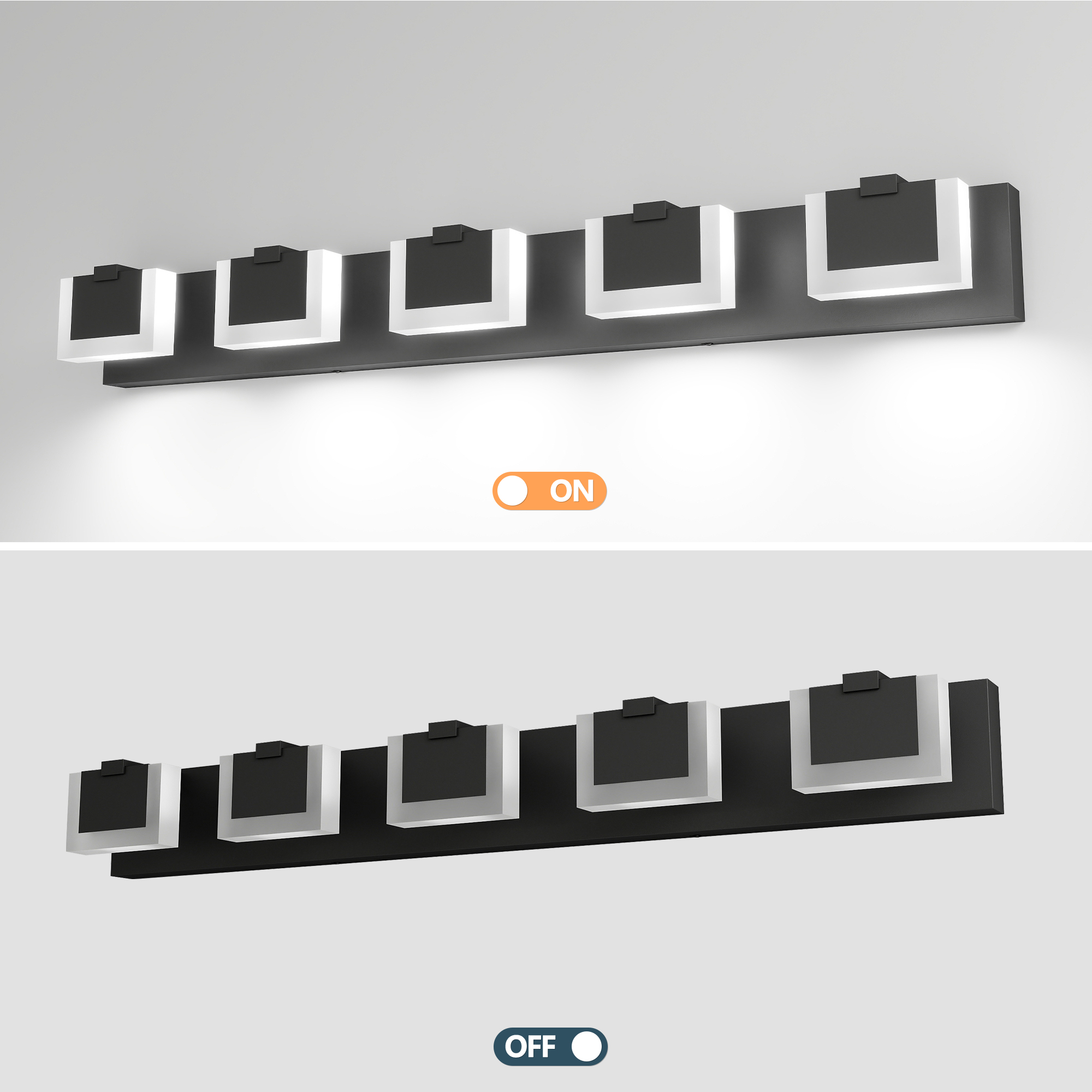 Modern and Minimalist: Up and Down Light creating a beautiful lighting effect.The luxurious and fashionable Bathroom Vanity Light fixtures design accords with the ultimate pursuit of modern people. The light comes from LED source and with a uniform light-emitting by going through the frosted acrylic.Easy to Install: Hard Wired. No switch or cord on these bathroom light fixtures. Just connect to the reserved wire directly. Suitable for US junction box standard.High Quality Material:Black aluminum frame,strong corrosion resistance.Solid thick frosted acrylic shade,releasing bright light effect.(LED Light include)Double output light effect:Up and down light design, bright and not dazzling.