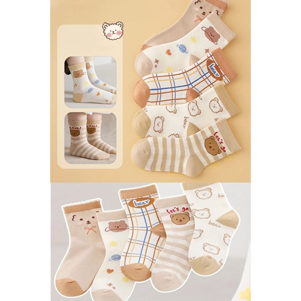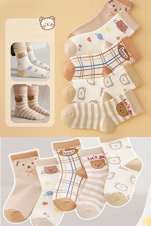 5 Pair Kids Bear Pattern Socks Soft Comfortable Daily Wear
