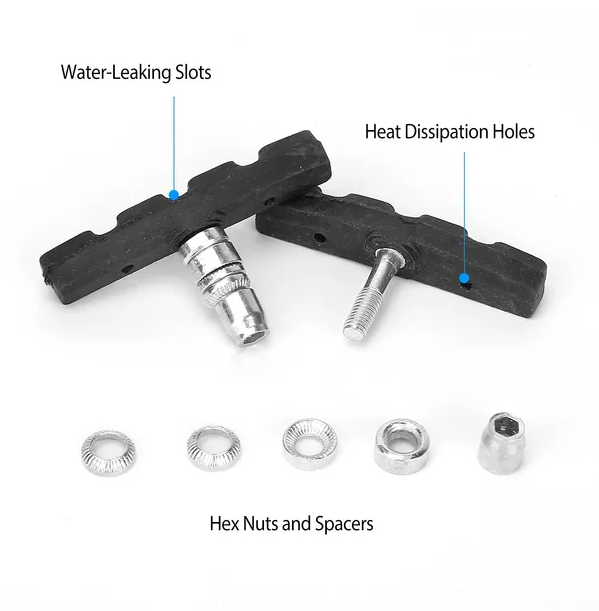** Heat-Resistant & Water Leakage*:Each brake pad comes with two holes and three slots for ventilation and draining water away. Help your bike keep good brake performance in adverse weather conditions.