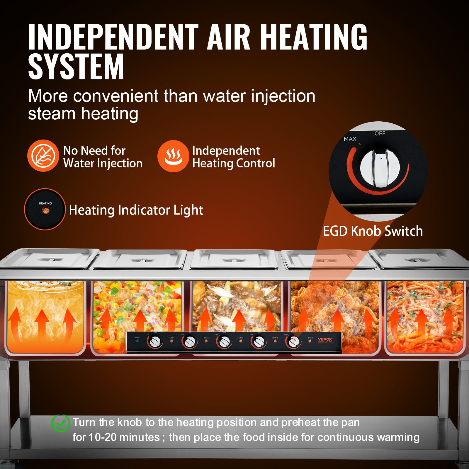 Independent Heating System: One knob switch controls one food pan. You can set the temperature independently for each pan to ensure optimal freshness and flavor. Our food warming table operates without the need for water, using air heat transfer for safe and convenient heating. Preheat for 10-20 minutes before heating delicious food. (This steam table is intended only for dry use).