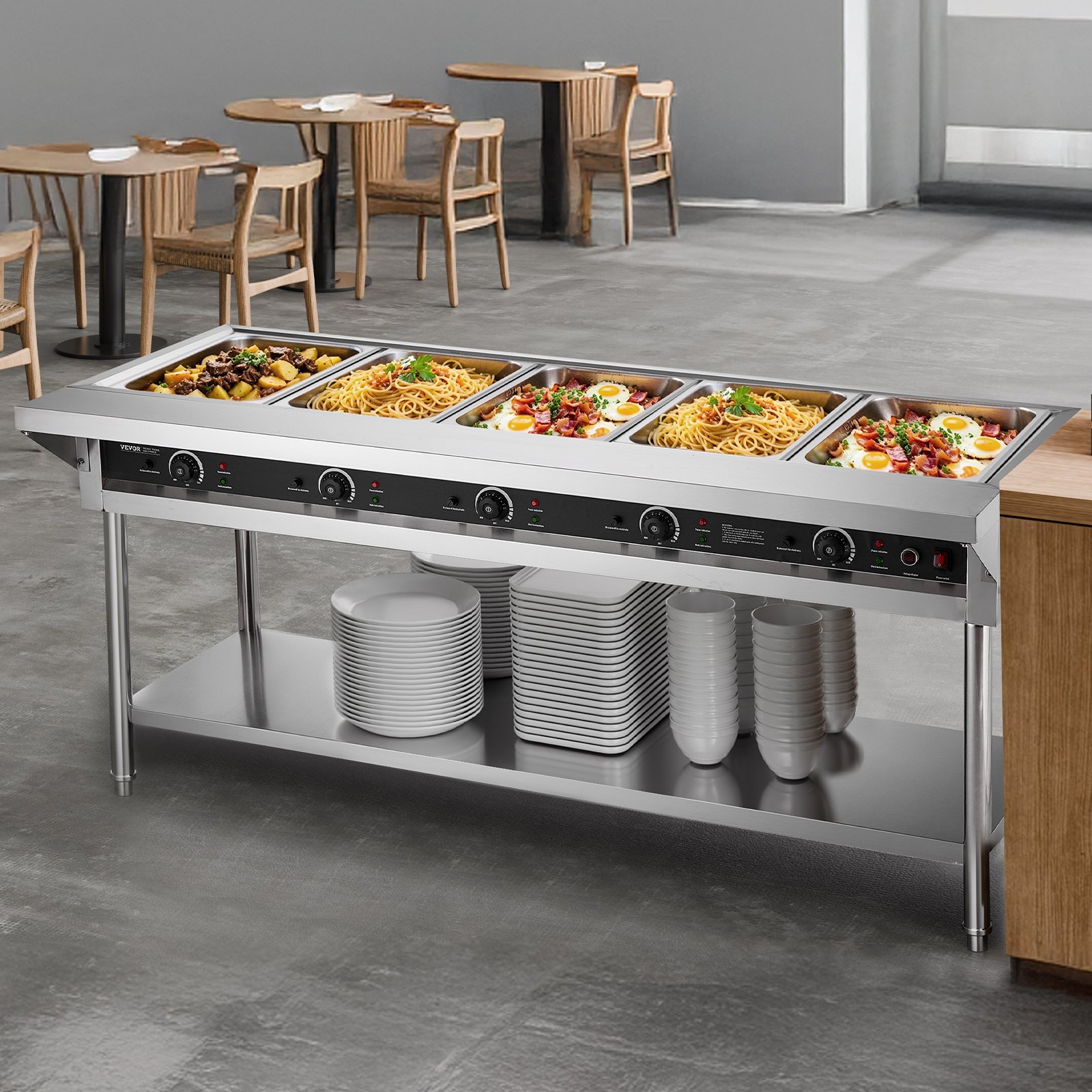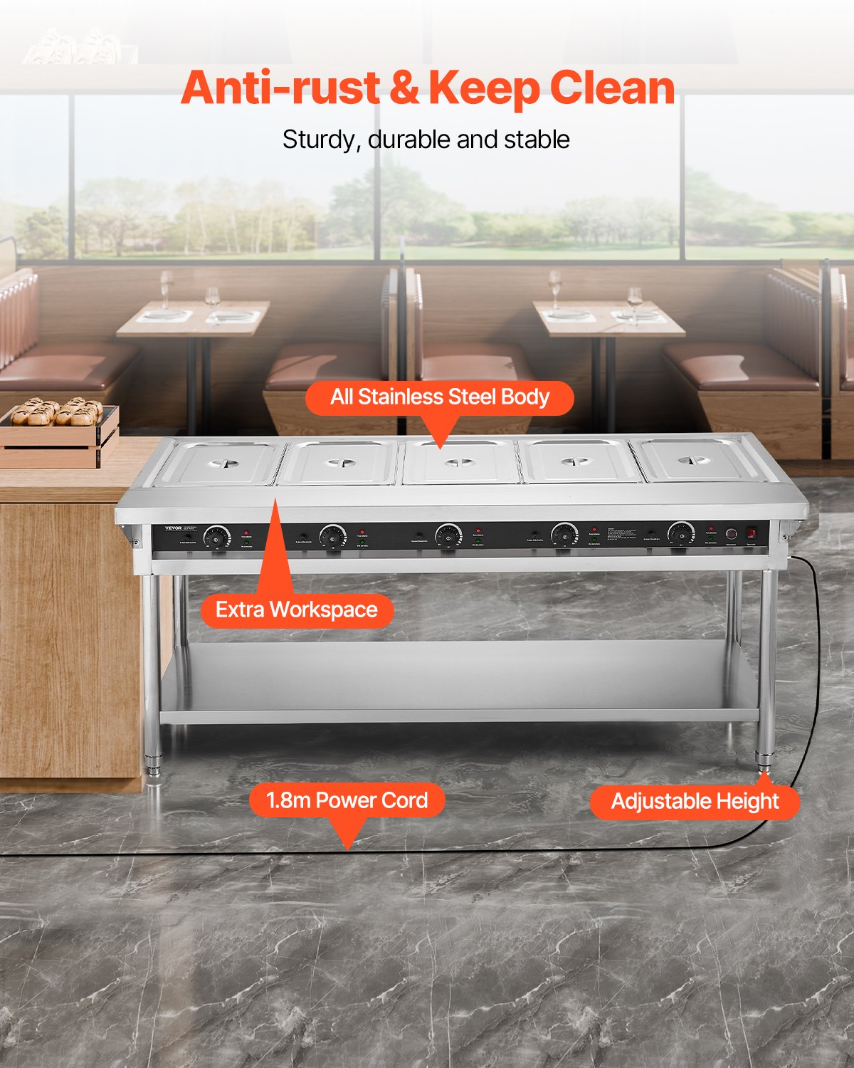 Commercial-Grade Large Capacity: Five full-size pans with a thickness of 0.55-0.6mm, our steam table is designed for flexible replacement and customized layout to meet a variety of dining needs. Our standardized machine dimensions are compatible with all pans up to 5.9 inch in depth