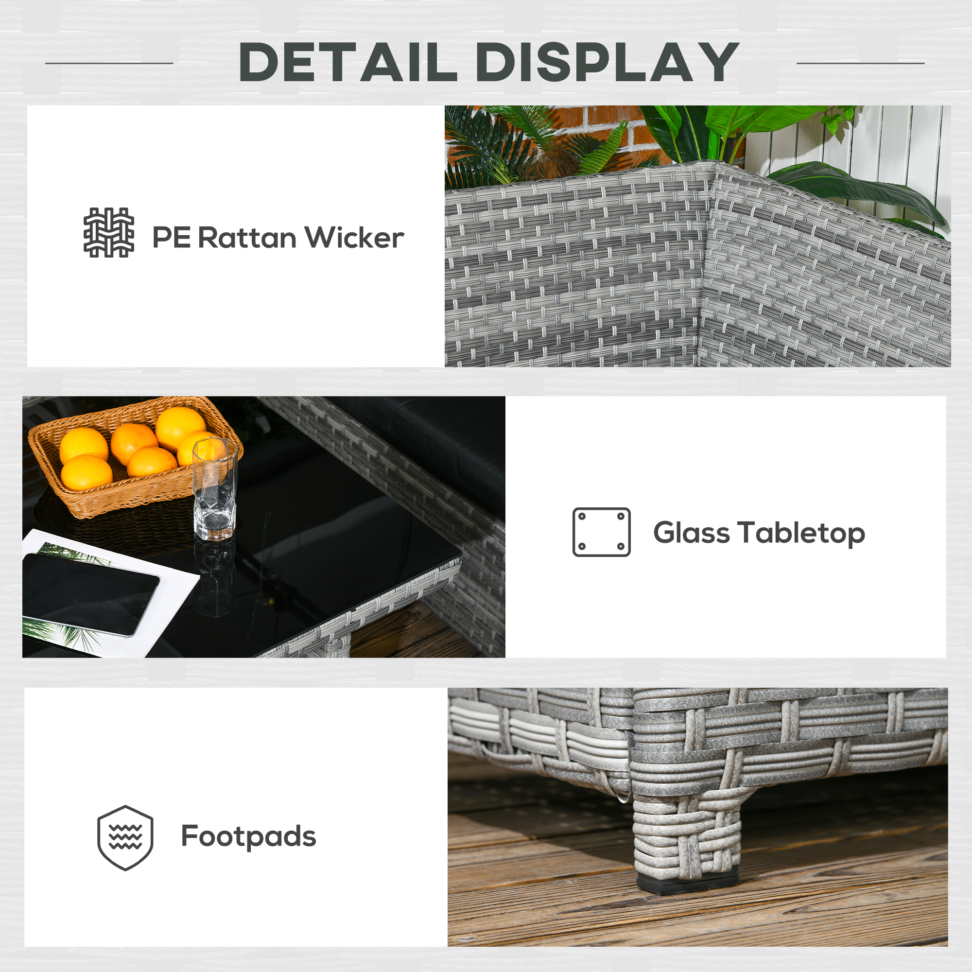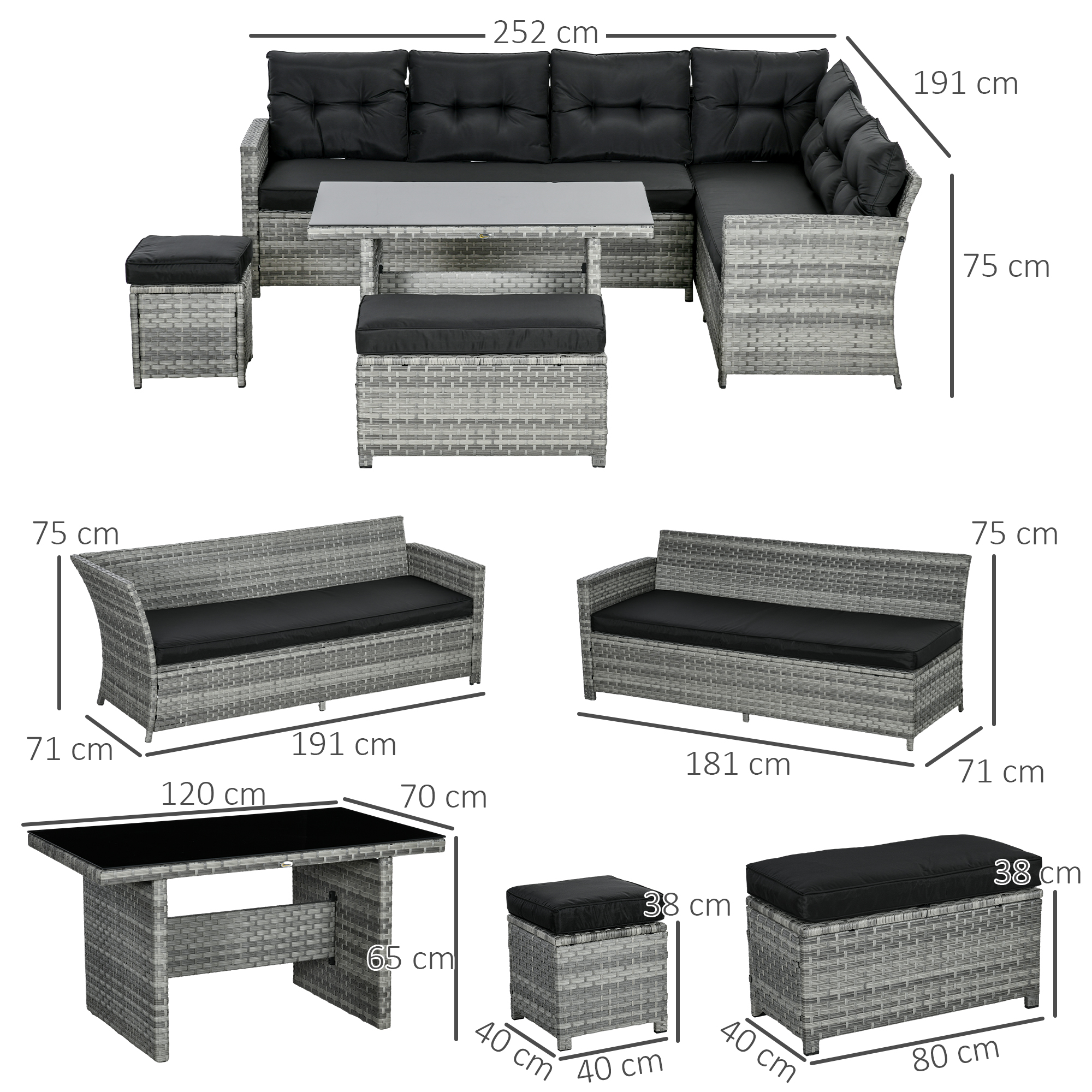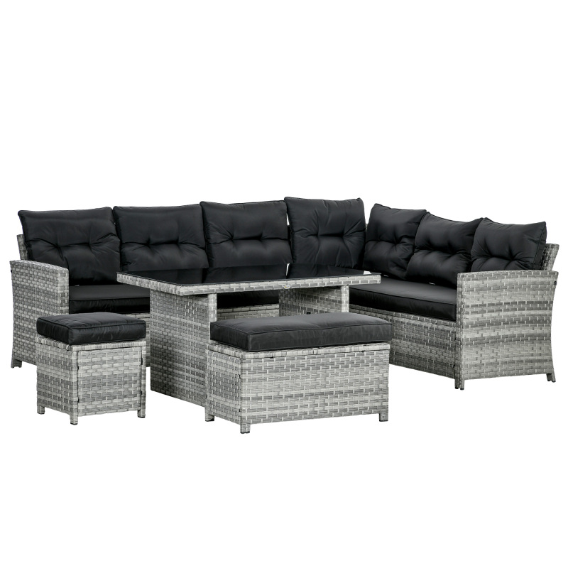 Make your outdoors just as inviting as the inside, thanks to this garden sofa set. Comes with two three-seater sofas, two stools and a matching coffee table - relax with company. Powder coated steel frames for a strong structure, wrapped in stylish and protective plastic wicker. Complete with seat and back cushions for comfort.