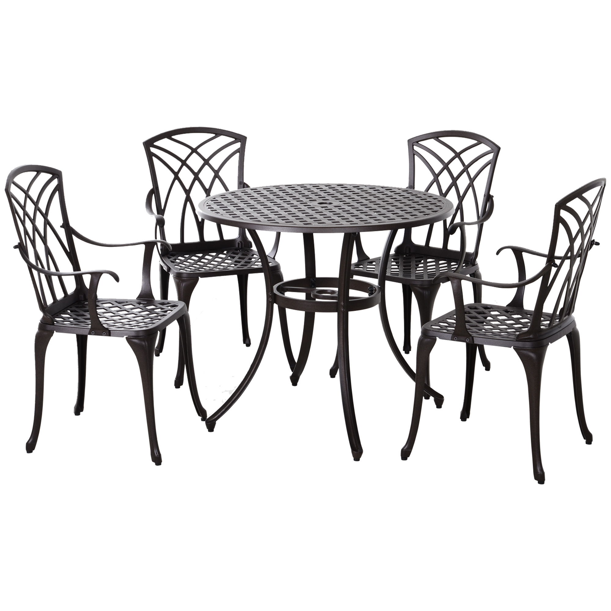This five-piece outdoor garden furniture set from will give you the optimal spot to dine and relax. It's formed of four chairs and a matching table, with cast aluminium forming the frame of all pieces to ensure they are robust and tough. Round in shape, the table features a middle hole to keep a sun parasol securely in place, with the back of the chairs showcasing a cut-out design for an attractive finish. Our outdoor table and chairs are great for flats and apartments with balconies.