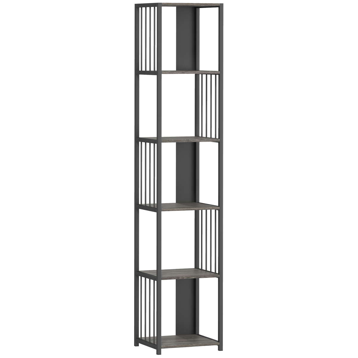 Transform your living space with the bookshelf, blending grey wood-effect and black steel for a modern, minimalist aesthetic. Built with MDF and robust steel pipes, its anti-tip straps ensure family safety, holding up to 60 kg. Featuring five open tiers, this bookcase organizes books, photos and plants, creating a personal, clutter-free haven that enhances your sense of belonging and accomplishment.