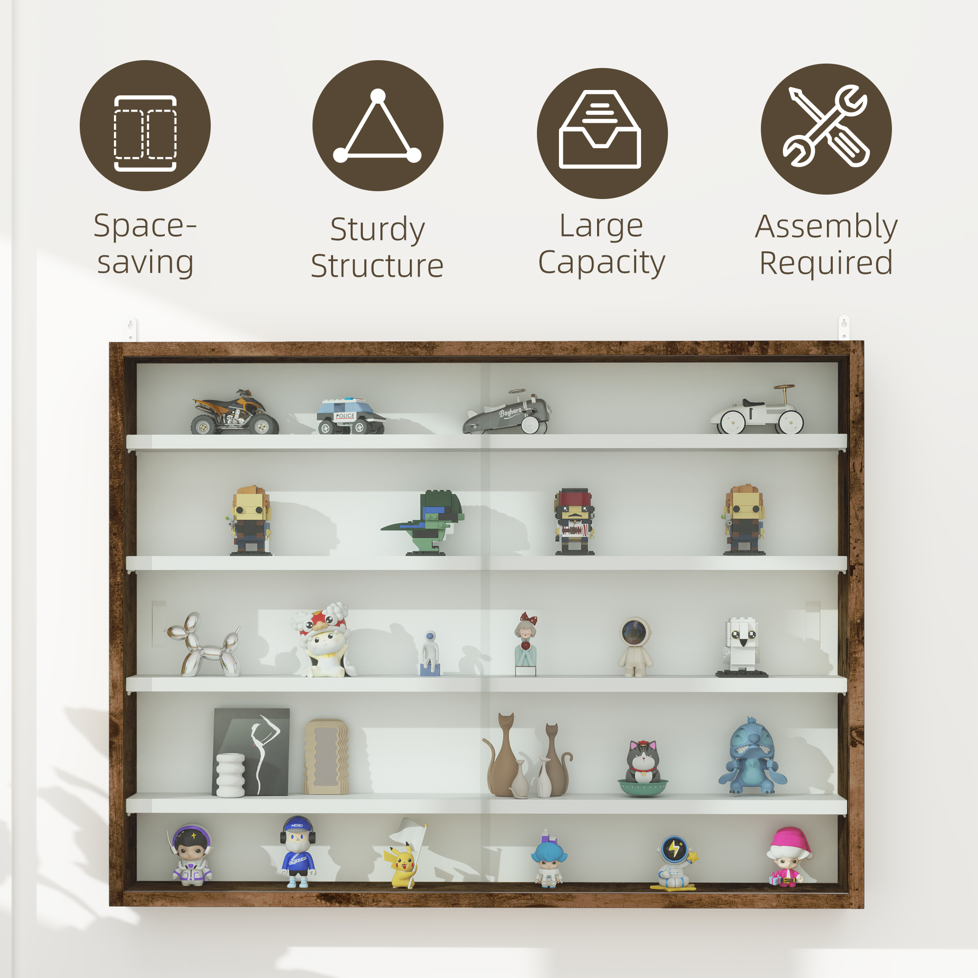 5-Tier Wall Display Shelf Unit Cabinet W/ 4 Adjustable Shelves Glass Doors Home Office Ornaments 60x80cm Rustic Brown