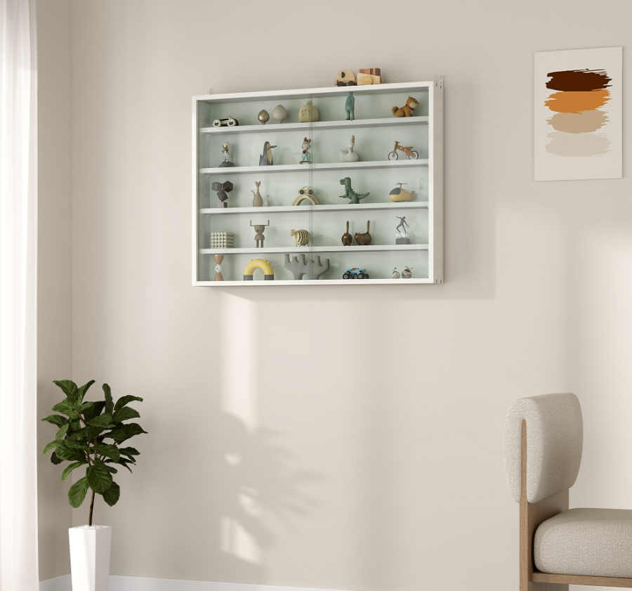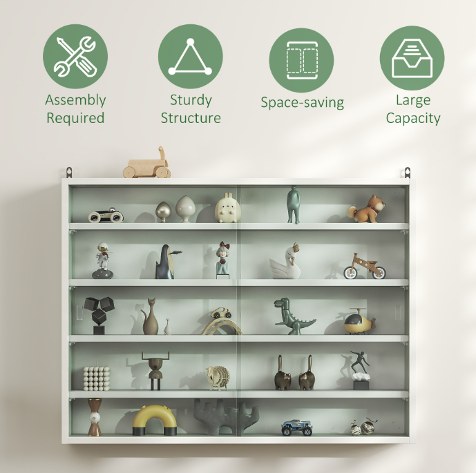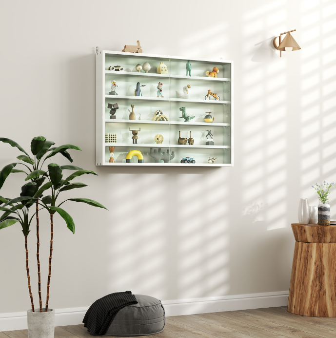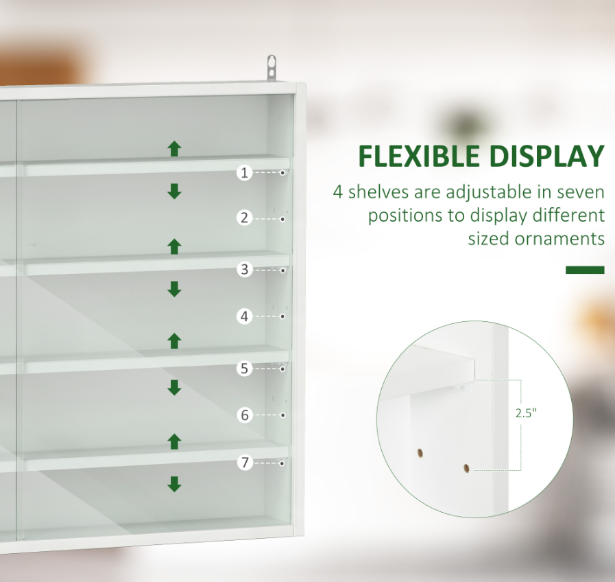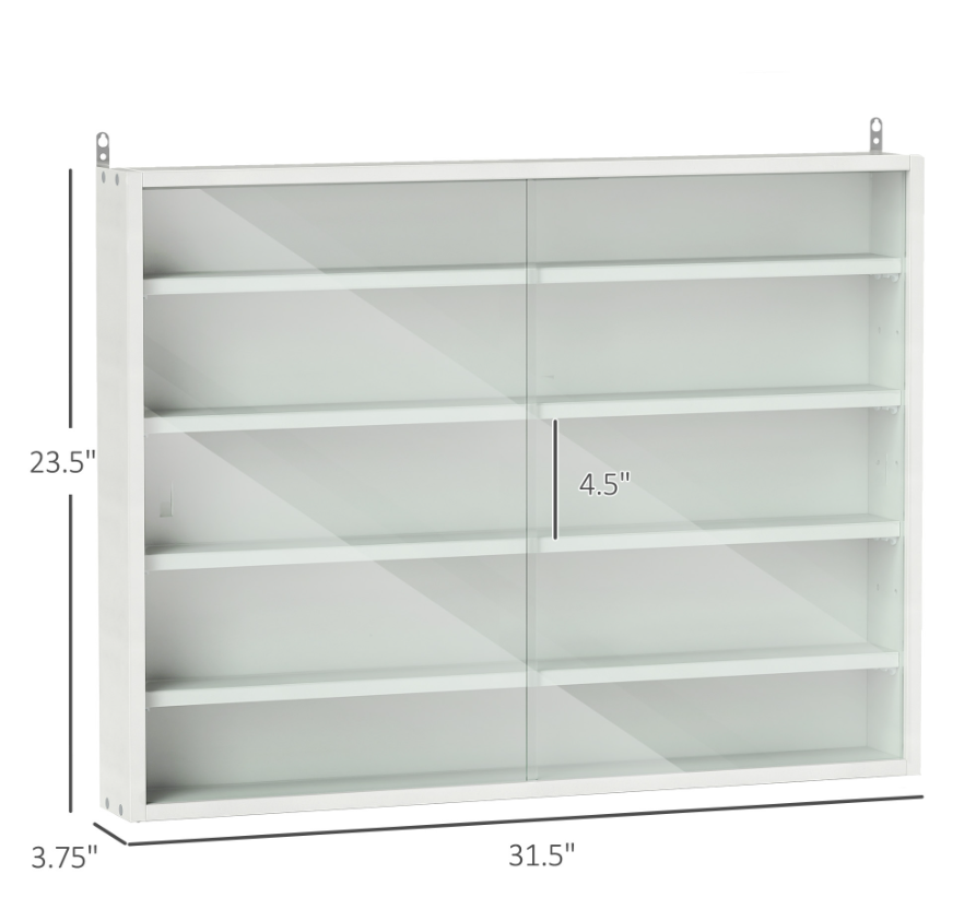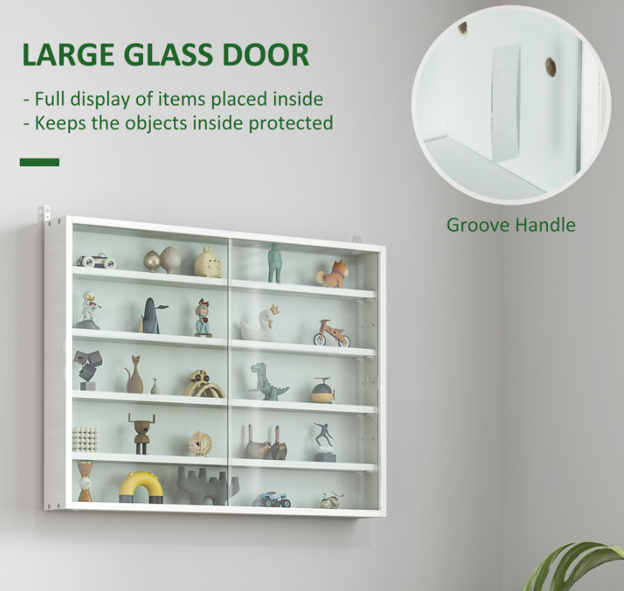5-Tier White Display Cabinet With Glass Doors & Adjustable Shelves, Wall-Mounted