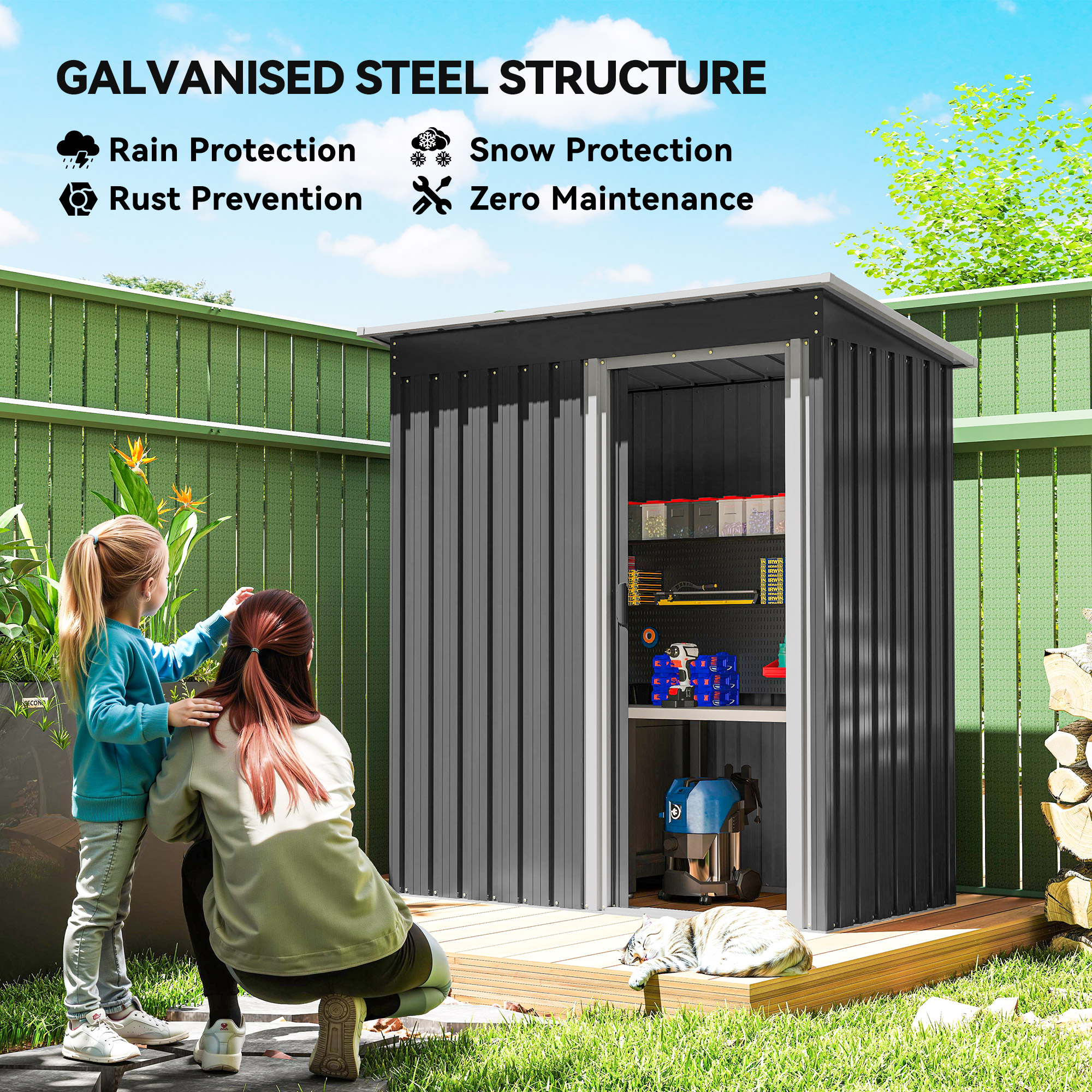 Small-medium tools and equipment easily stored with this outdoor storage shed. The 76 x 150cm inner storage is accessed easily with the single sliding door: pull it to open/close easily. Made from galvanised steel, this metal storage shed is strong and suitable for year-round outdoor use. With a sloped roof, they'll be as little water build-up on the roof, helping to preventing leaking through to inside.