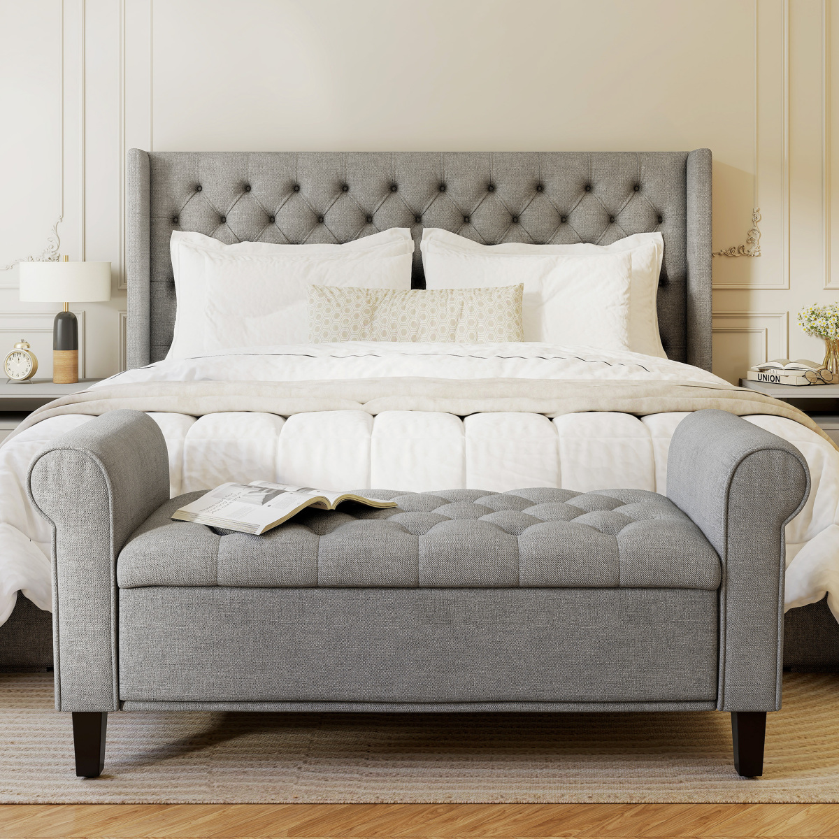 - Traditional-Style Bench: Soft, rolled arms with a button-tufted cushion creates a comfortable, traditional feel. This bed end bench's classic color combination makes it all-match decor to fit any interior style.