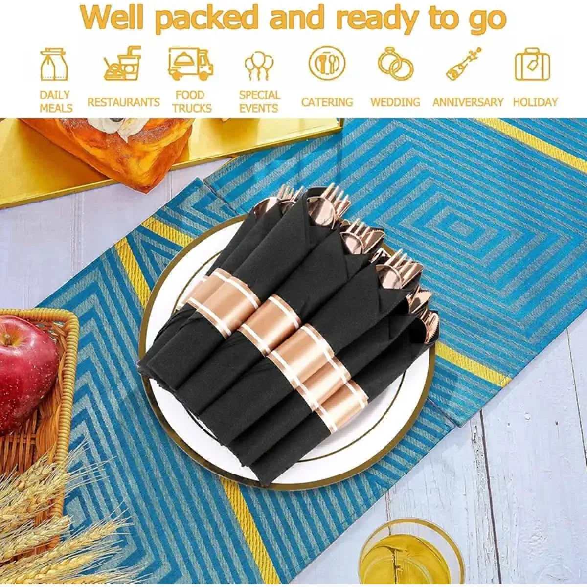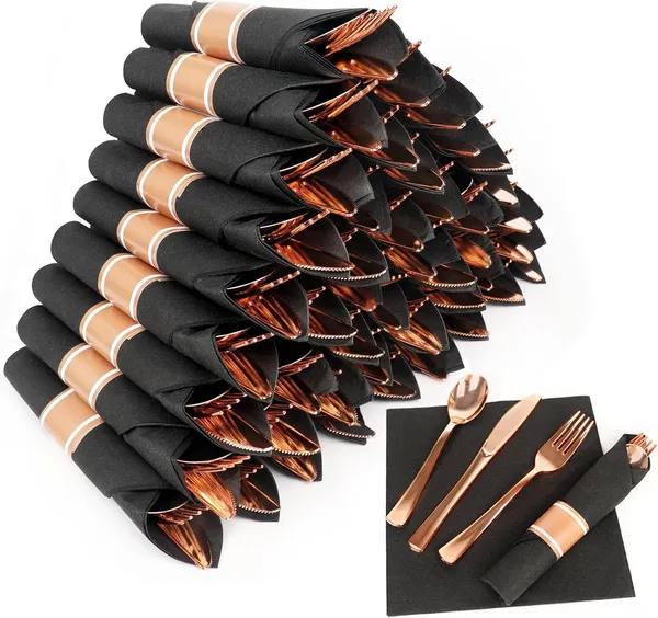 50 Pack Pre Rolled Rose Gold Plastic Silverware Set,Wrapped Plastic Cutlery Set With Napkin Include 50 Forks,50 Spoons,50 Knives And 50 Black Napkins For Party, Wedding