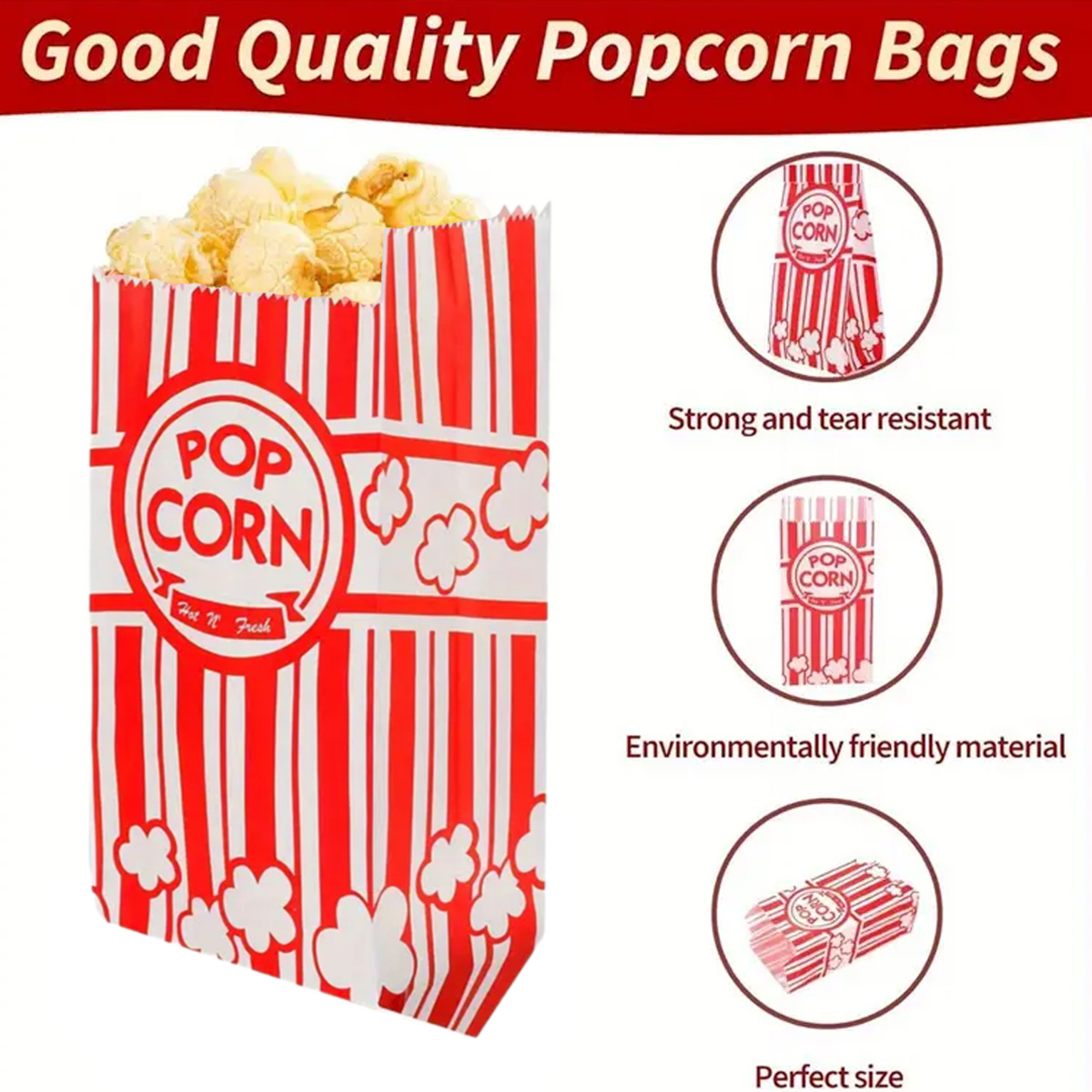 Size:21*9*6cm/8.27*3.54*2.36inch Package contents: 50 pcs Popcorn Bags