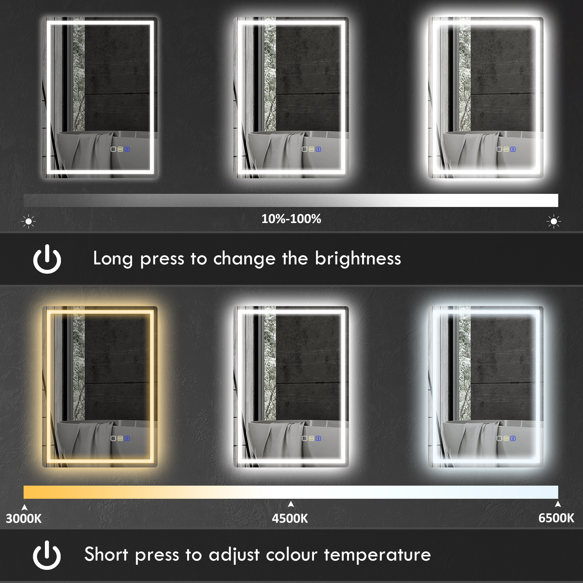 The perfect illumination to get ready, with your favourite songs providing the soundtracks. This bathroom mirror is fitted with bluetooth - connect your phone to listen to music as you get ready. With 240 LED beads around the edge, this mirror provides plenty of illumination - customise the colour and brightness as you require. Complete with a glowing touch control, making it easy to use - even in the dark.