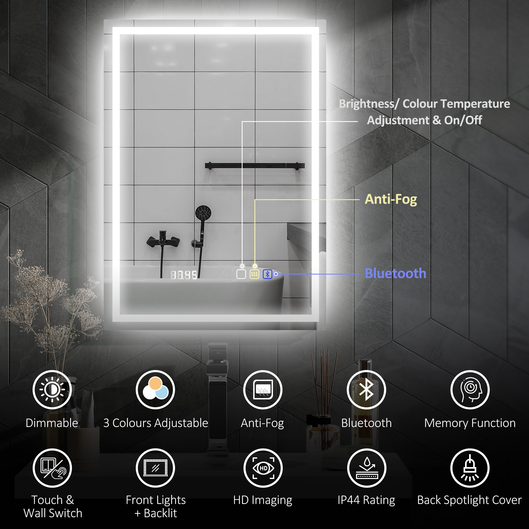 The perfect illumination to get ready, with your favourite songs providing the soundtracks. This bathroom mirror is fitted with bluetooth - connect your phone to listen to music as you get ready. With 240 LED beads around the edge, this mirror provides plenty of illumination - customise the colour and brightness as you require. Complete with a glowing touch control, making it easy to use - even in the dark.