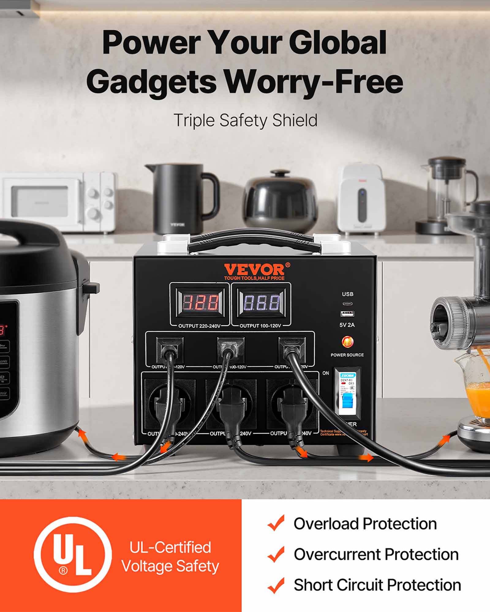 5000W Spannungswandler Transformator AC 110V⇋220V Transformer Wandler 3x US NEMA 5-15R 3-polige / 3x Europäische Shucko-Ausgangssteckdosen, 1x 5V-USB-Anschluss Und 1x Typ-C-Buchse