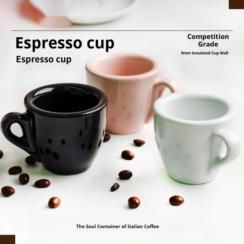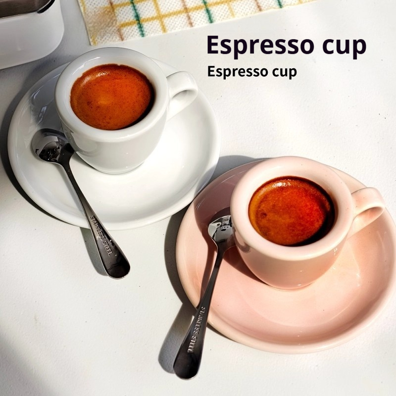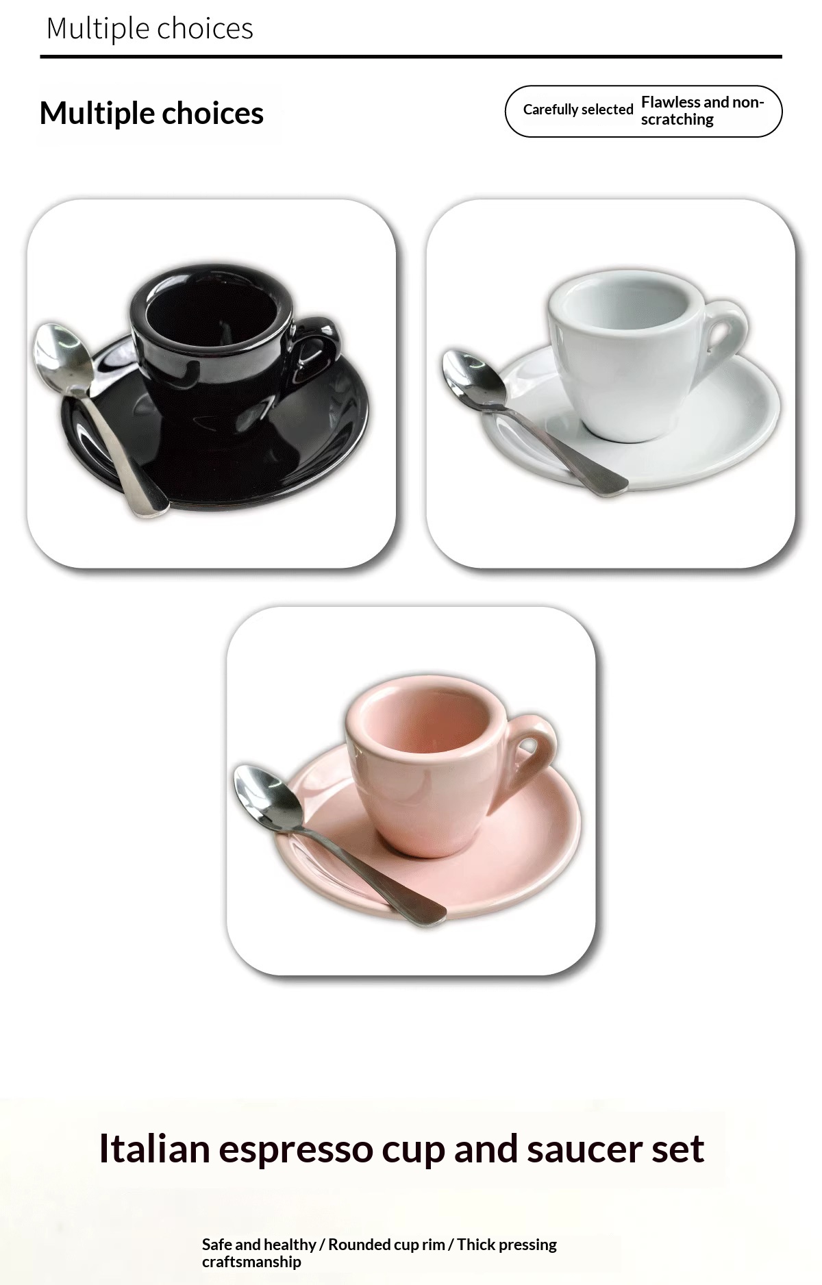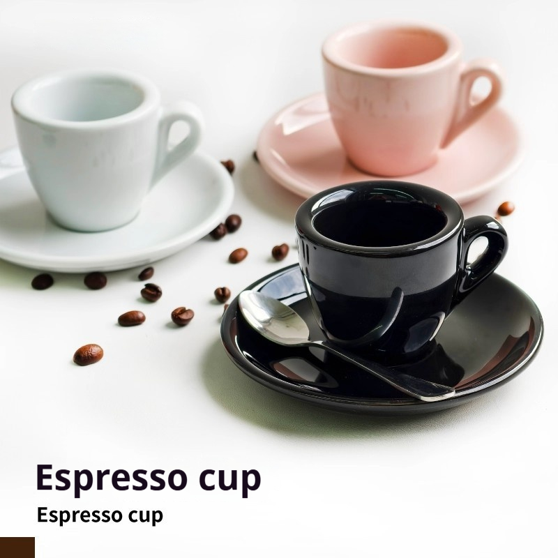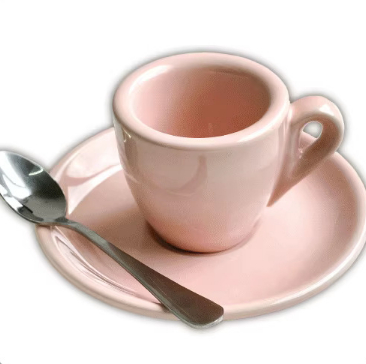 Colors: White-glazed cup and saucer (with free spoon), black-glazed cup and saucer (with free spoon), pink-glazed cup and saucer (with free spoon)