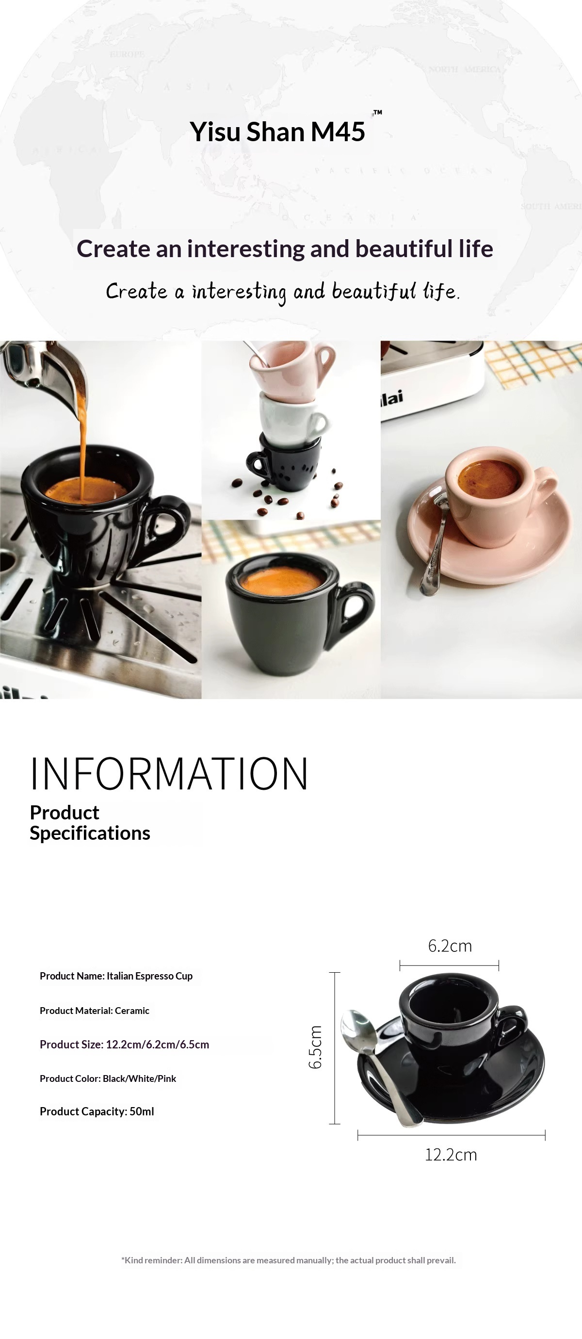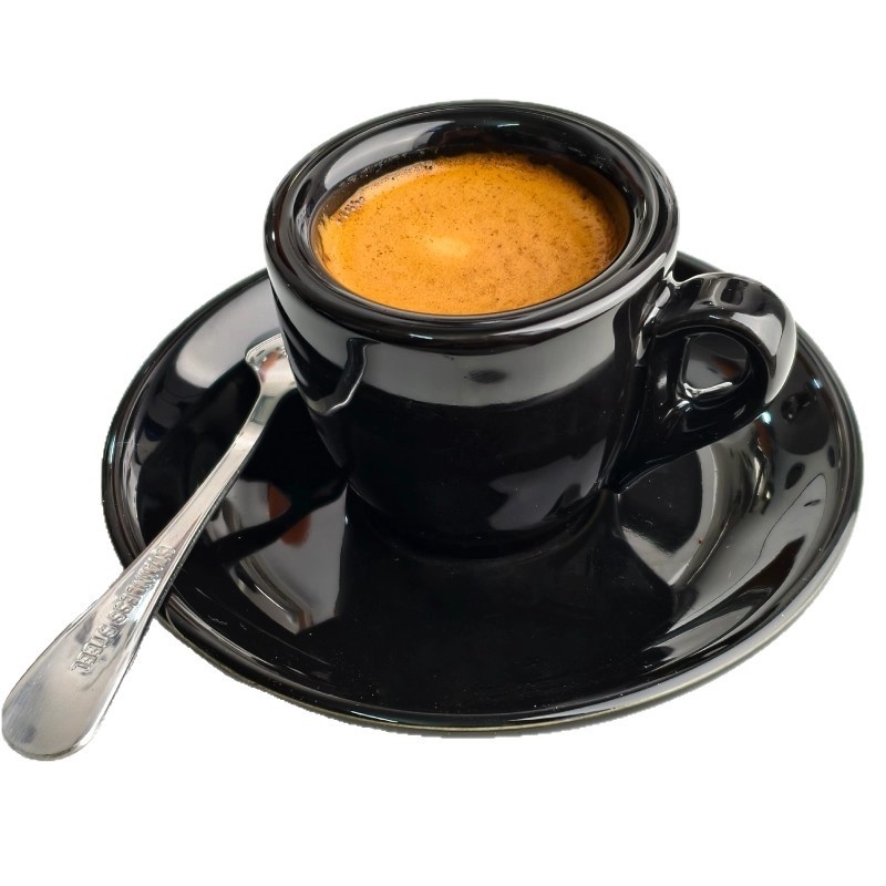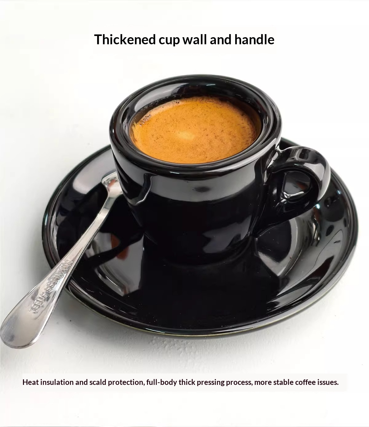 Colors: White-glazed cup and saucer (with free spoon), black-glazed cup and saucer (with free spoon), pink-glazed cup and saucer (with free spoon)