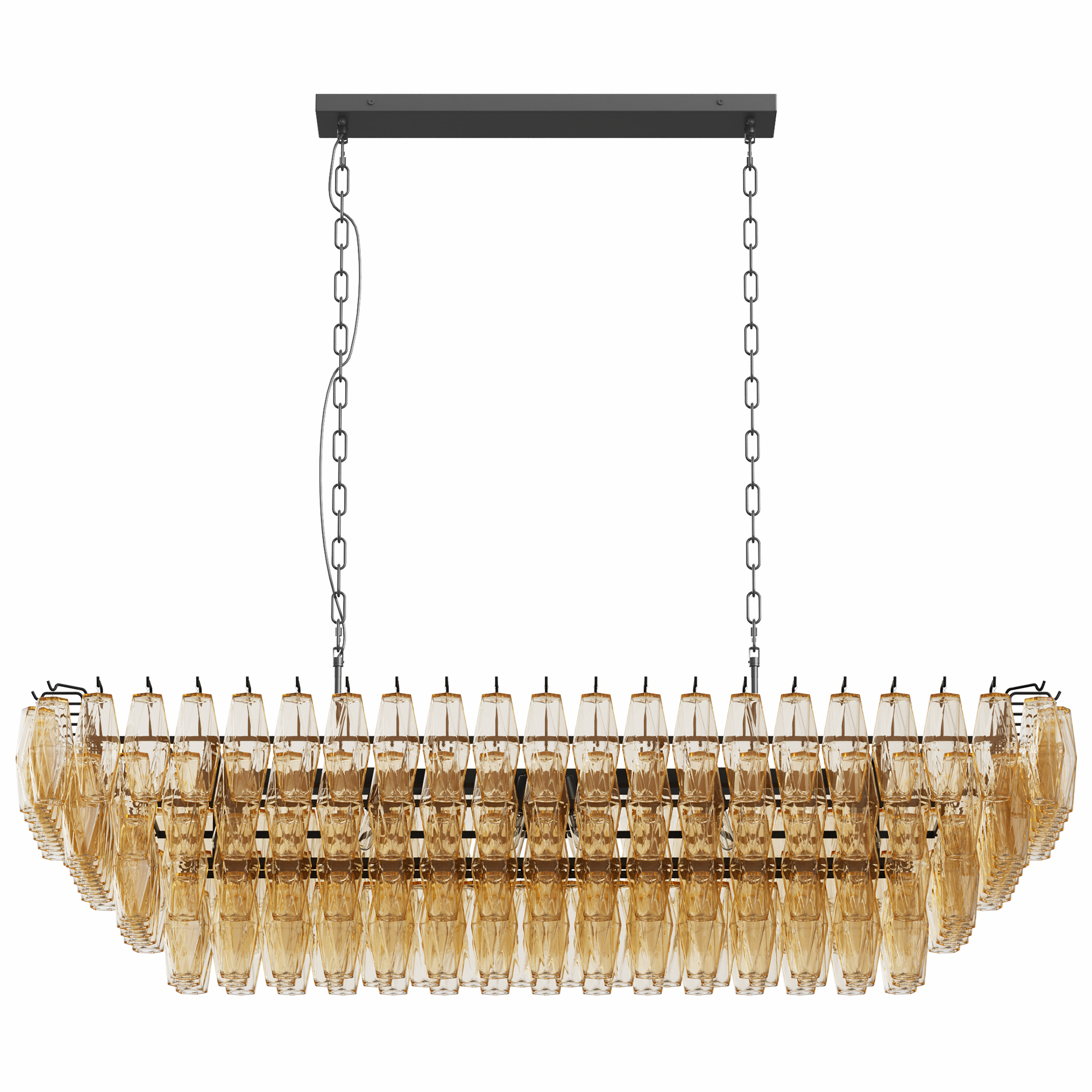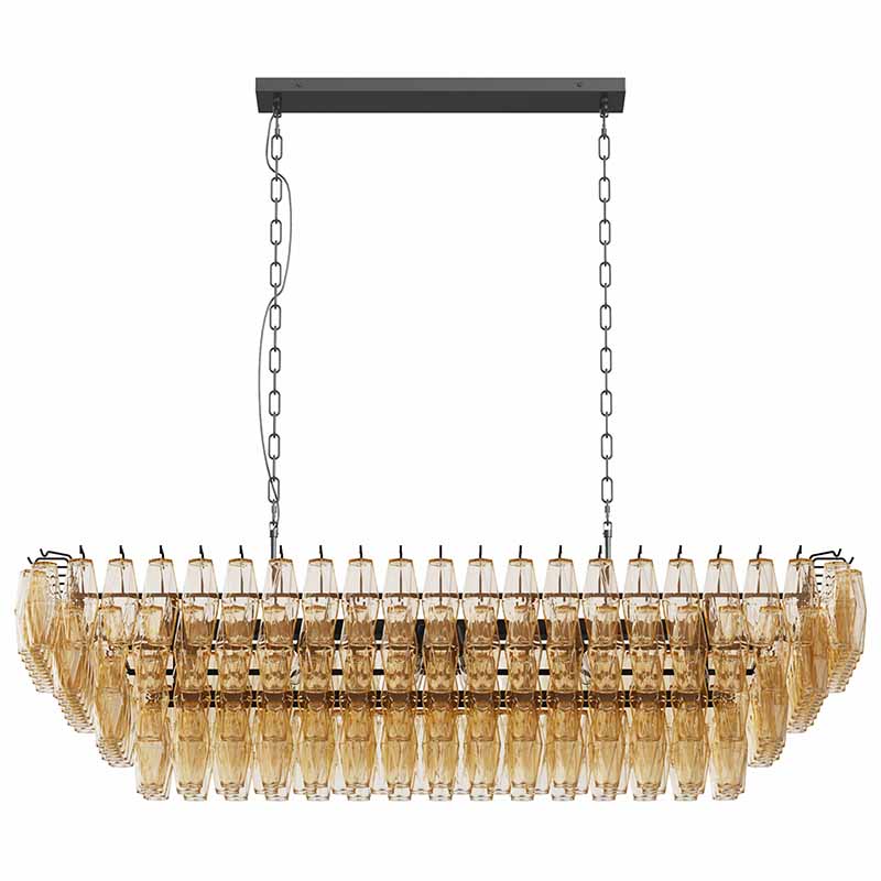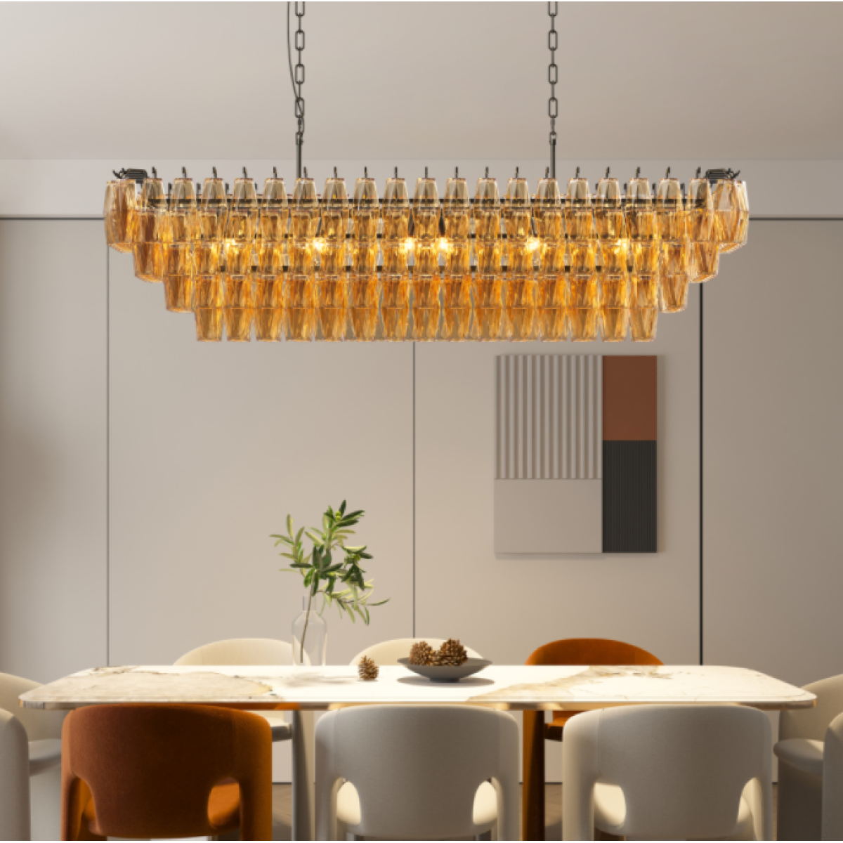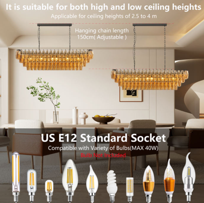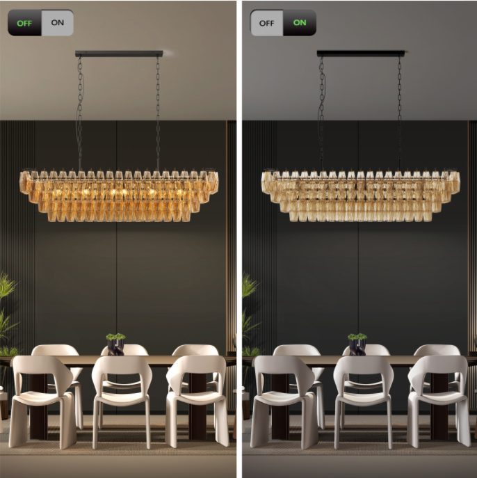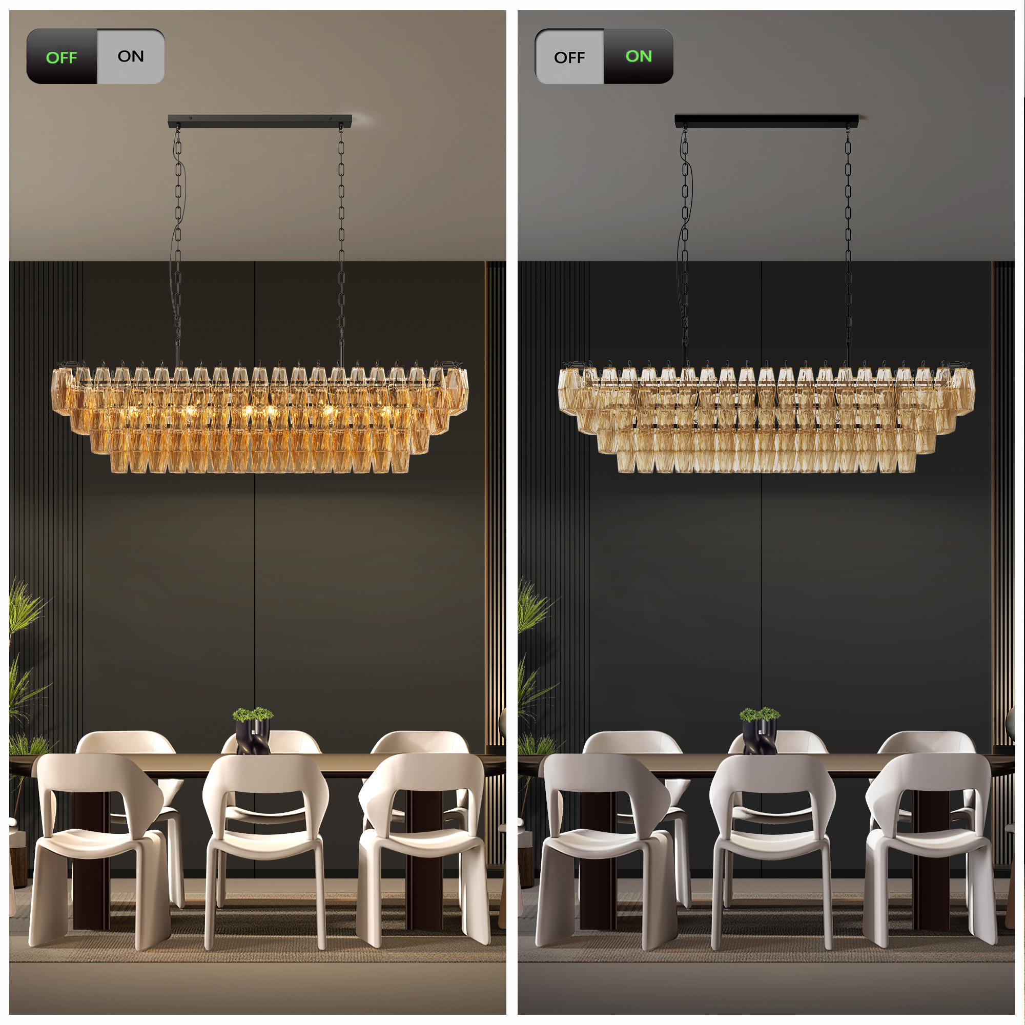 [UNIQUE SMOKE GLASS DESIGN]The modern black chandelier lampshade is made of tiered glass, all smoke glass tubes are suspended on the metal frame circle, combining with the room decorated to create an atmosphere of elegance and luxury. The beautiful glass lampshade refract different colors of light, creating a warm and soft lighting atmosphere.[PREMIUM BRUSHED METAL FRAME]The rectangular chandeliers for dining room with brushed metal frame has been redesigned, full body is made of durable high quality metal,more thickened than others on market,enhancing the overall texture and aesthetic while offering excellent durability and safety.[PENDANT LIGHT SPECIFICATION]The dining room light fixture L54". Cable adjustable height: up to 59 inches (150cm), equipped with convenient cable locks for quick suspension height adjustment, suitable for flat, sloped and vaulted ceilings.[WIDELY USE]This dining chandeliers over table is suitable for industrial, modern, farmhouse style home decor. It is suitable for various spaces including restaurants, kitchens, kitchen island, entrance, living rooms, dining tables, hotels, bedrooms, offices, and conference rooms.