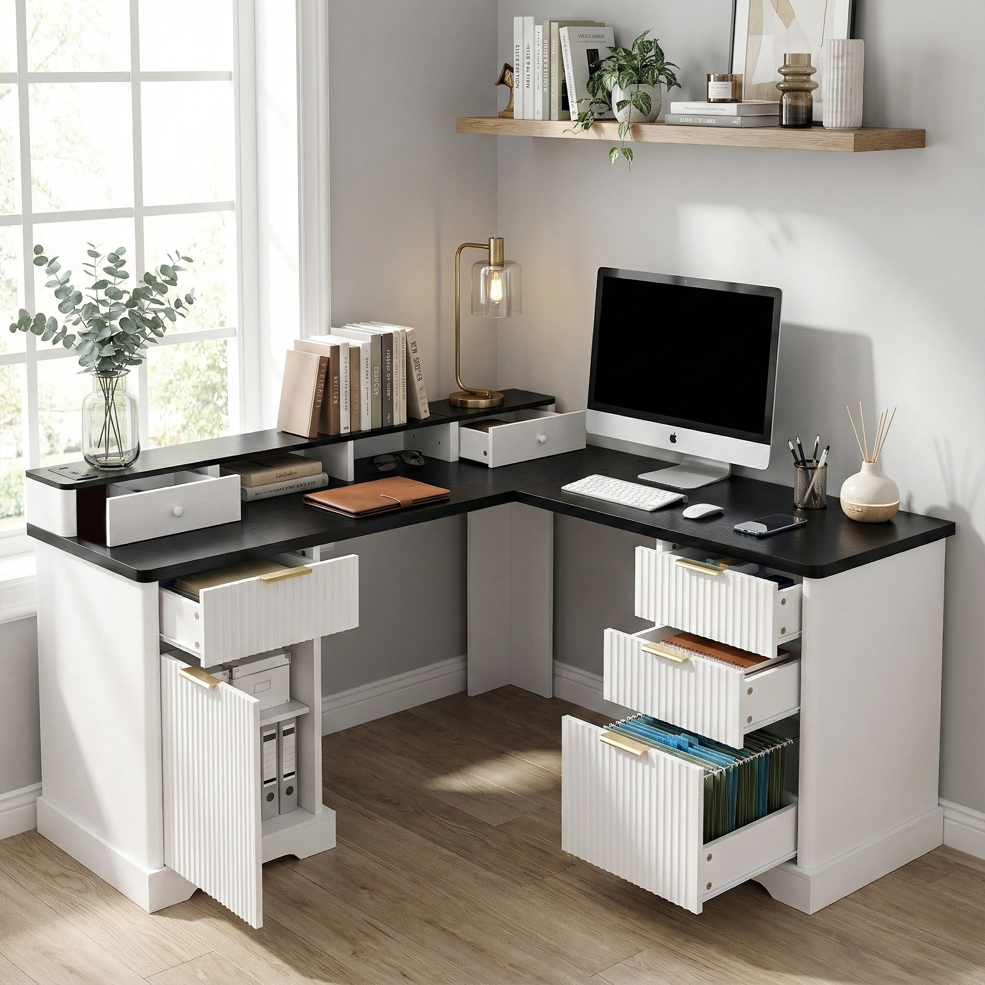 Product Name:59" Modern Fluted L-Shaped Desk with Charging Station & Storage Cabinet - Home Office Computer Desk with Monitor Stand, File Drawer and Removable Support Shelf for Study, Home Office, White