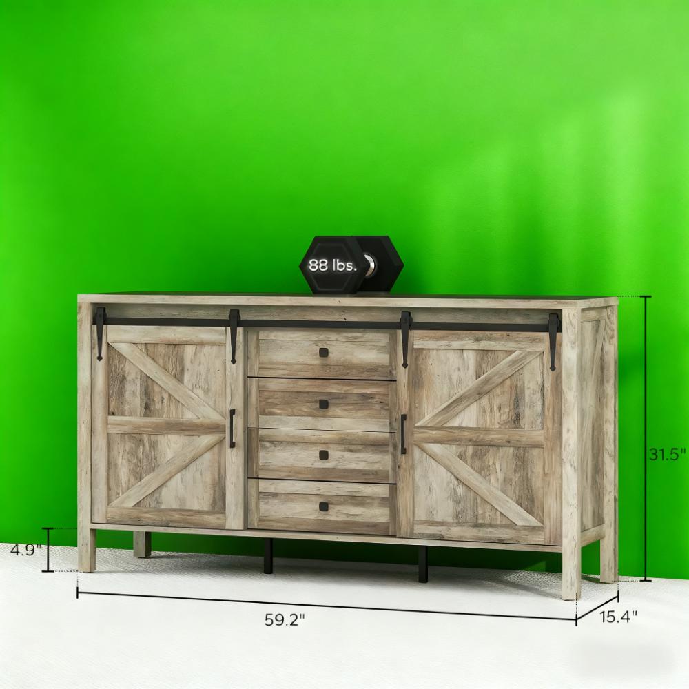 Features: - Wide countertop comfortably for brewing essentials, such as cups, coffee maker, and kettle - Four drawers and two side cabinets with three-level adjustable shelves - Classic sliding barn doors, black metal accents, and vintage handles add farmhouse charm - Great as a kitchen storage cabinet, TV stand, credenza, or entryway cabinet - MDF and particleboard frame with 0.9" thick top supports up to 260 lbs. - Supported by six legs with anti-slip foot pads and anti-tipping devices for stability - 4.9" gap below allows for easy vacuuming underneath - Assembly required Specification: - Color: Gray Wash - Materials: MDF, Particleboard, Metal - Overall Dimensions: 59.2" W x 15.4" D x 31.5" H - Tabletop Thickness: 0.9" - Drawer Inner Size: 16.6" W x 11.2" D x 3.1" H - Cabinet Inner Size: 18.1" W x 12.2" D x 25.2" H - Bottom Height to Floor: 4.9" - Weight Capacity: 260 lbs. (total), 88 lbs. (top), 66 lbs. (bottom board), 17.6 lbs. (shelf/drawer) Package Includes: - 1 x Sideboard - 1 x Manual