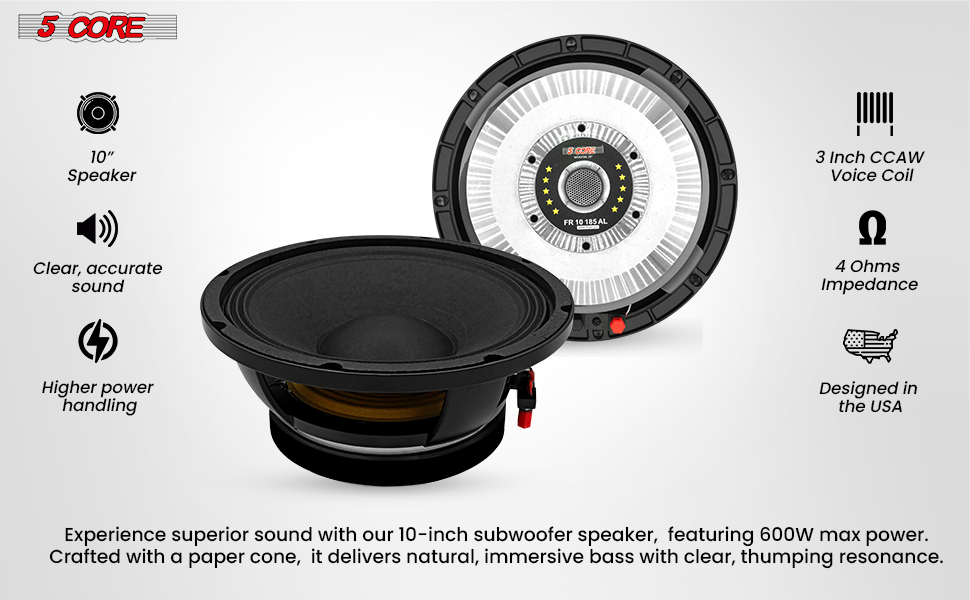 5CORE 10 Inch Subwoofer Speaker 600W 4 Ohm Full Range Replacement DJ Bass Sub Woofer Loudspeaker 3" Voice Coil 96 Oz Magnet Aluminum Frame