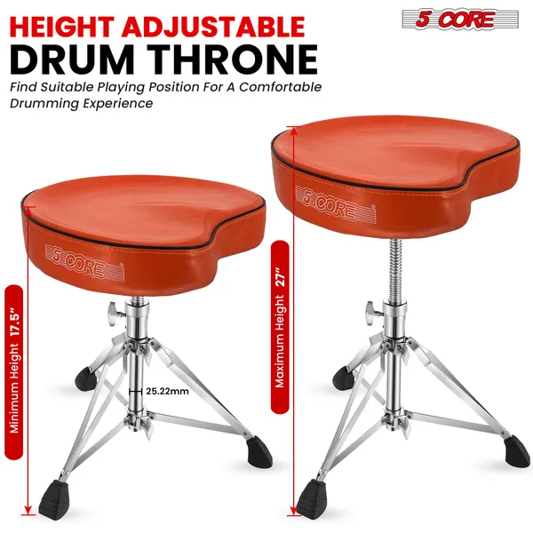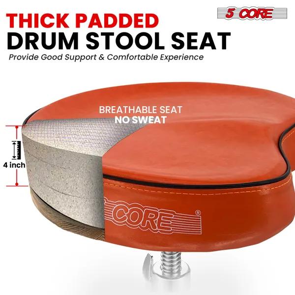Experience amazing comfort with our thick padded drum throne, featuring a 4 inch high-density soft sponge seat. The swivel height adjustable mechanism lets you rotate the seat 360 degrees. Adapts easily to different drumming setups and techniques. Height can also be changed from 17.5 to 27 inches, accommodating both adults and kids and supporting up to 441 lbs. This guitar stool is designed for durability, its heavy-duty metal frame and reinforced joints ensure lasting performance. The tripod legs feature large anti-slip rubber caps, providing superior stability and floor protection from scratches and damage. Easy to install; just unfold, insert the seat, and secure it with knob screws. Its portable, foldable design makes it perfect for gigs and rehearsals. With a sleek, modern look, this versatile drum throne doubles as a guitar stool, DJ chair, and more.