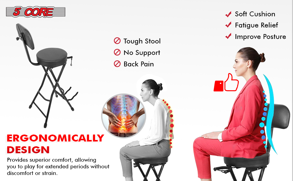 The guitar chair features a crossbar that provides support for your foot and serves as a dedicated footrest for a more comfortable playing experience.