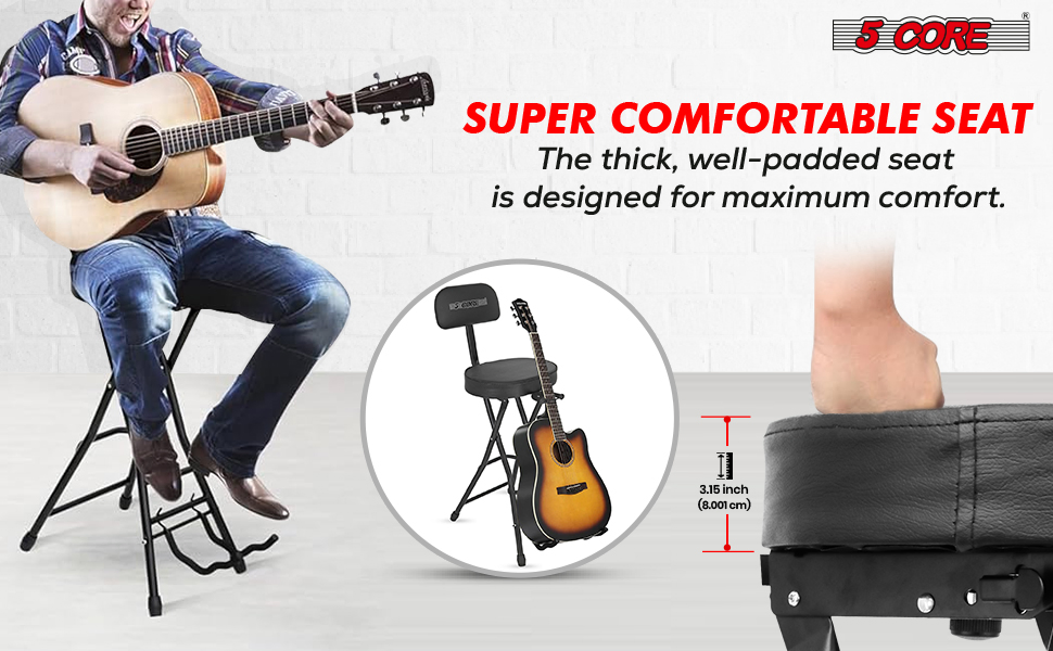 Improve your playing experience with the 5 Core 3-in-1 guitar chair. This professional stool combines a guitar stand, footrest, and chair, accommodating acoustic, electric, and bass guitars. The guitar chair has a maximum capacity of 300 lbs, making it perfect for guitarists of all ages. Enjoy superior comfort with a thick padded seat and removable ergonomic backrest. The soft EVA foam padded cradle arms keep your guitar safe from scratches.