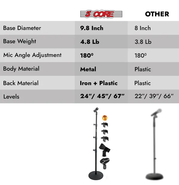 WIDE APPLICATIONS - 5 Core tall mic stand comes with small and large mic clips, compatible with most microphones on the market.