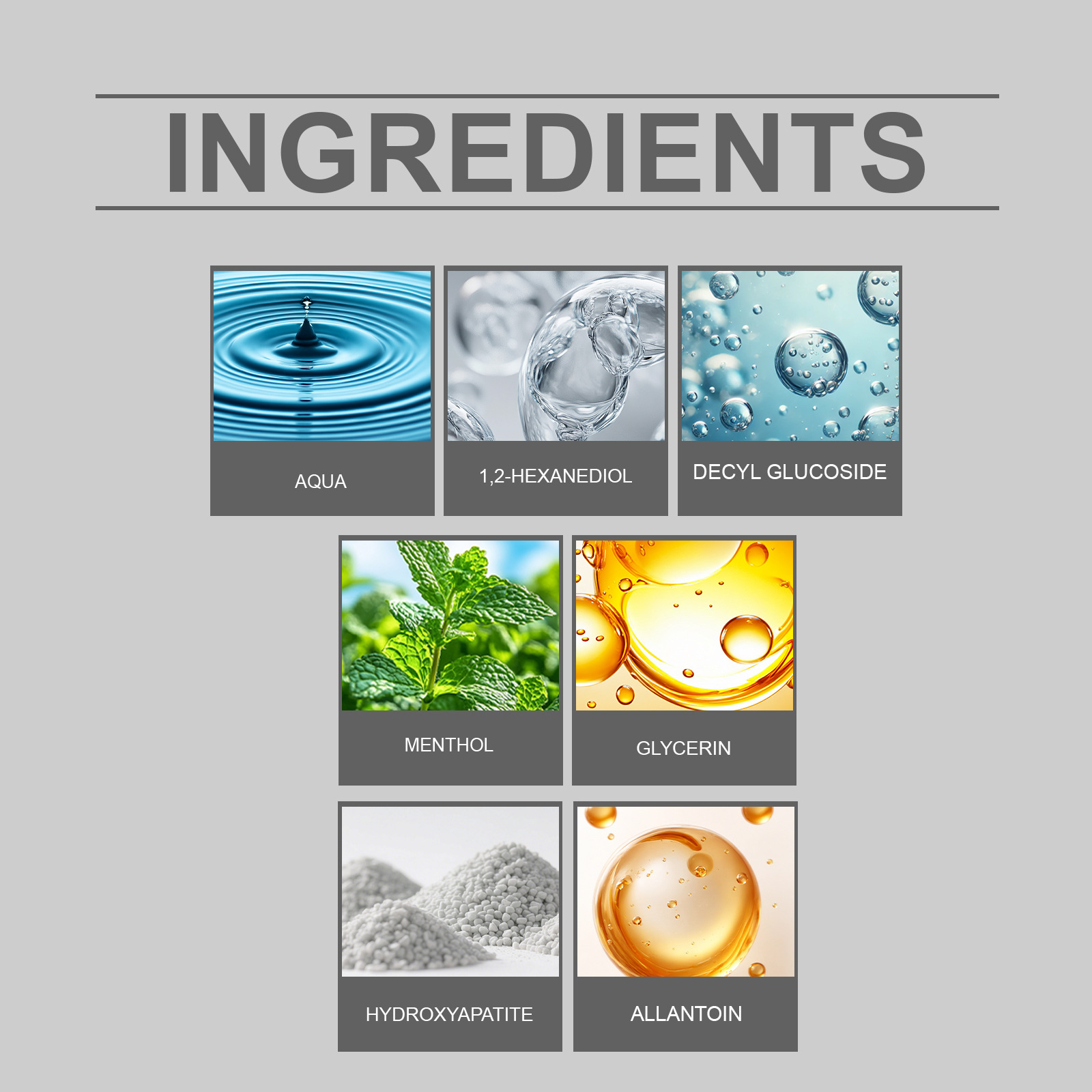 Ingredients: water, hydroxyapatite, glycerin, decyl glucoside, 1,2- hexanediol, allantoin, menthol.
