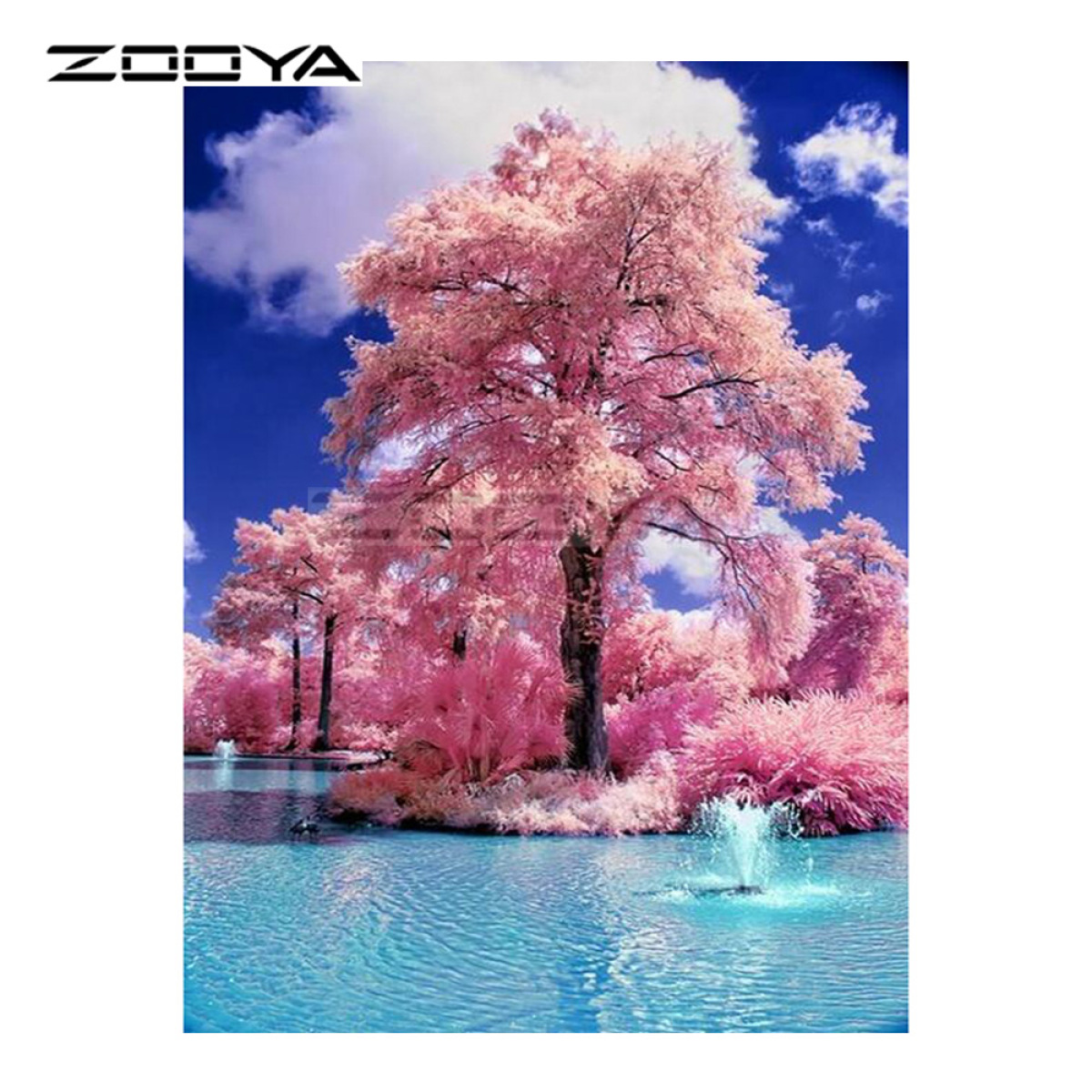 5D DIY Diamond Embroidery Landscape Lake Pink Cherry Tree Diamond Painting Cross Stitch Full Drill Mosaic Decoration
