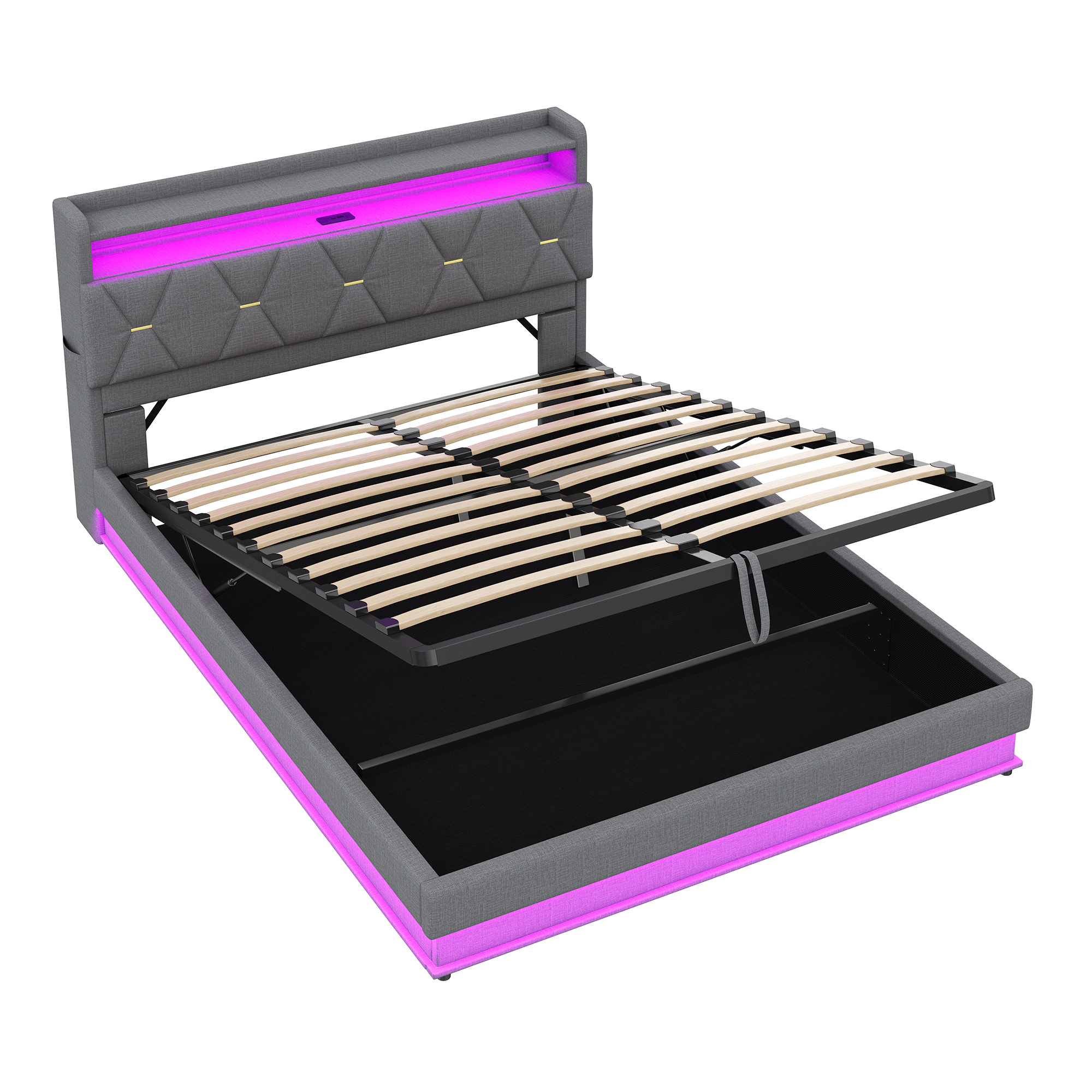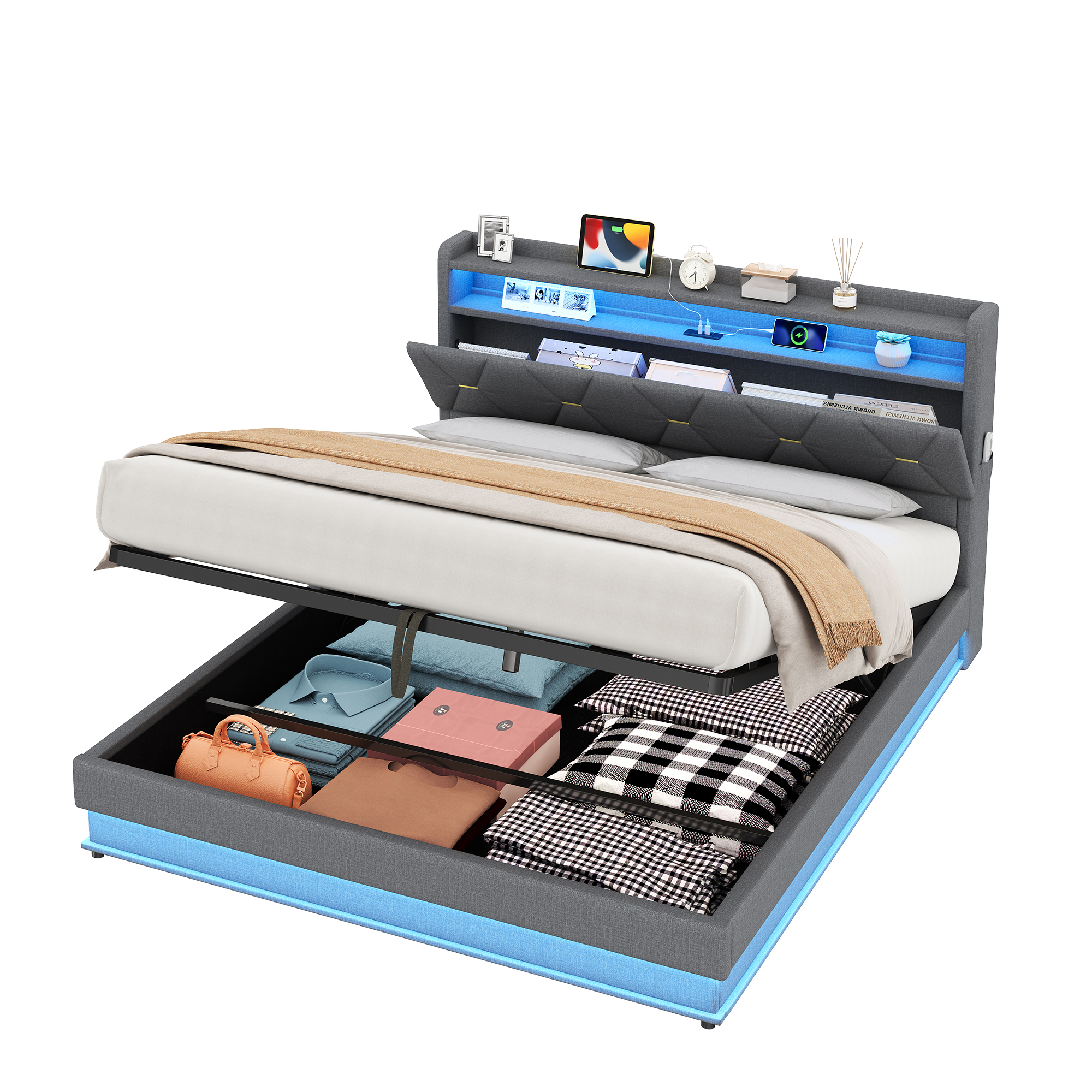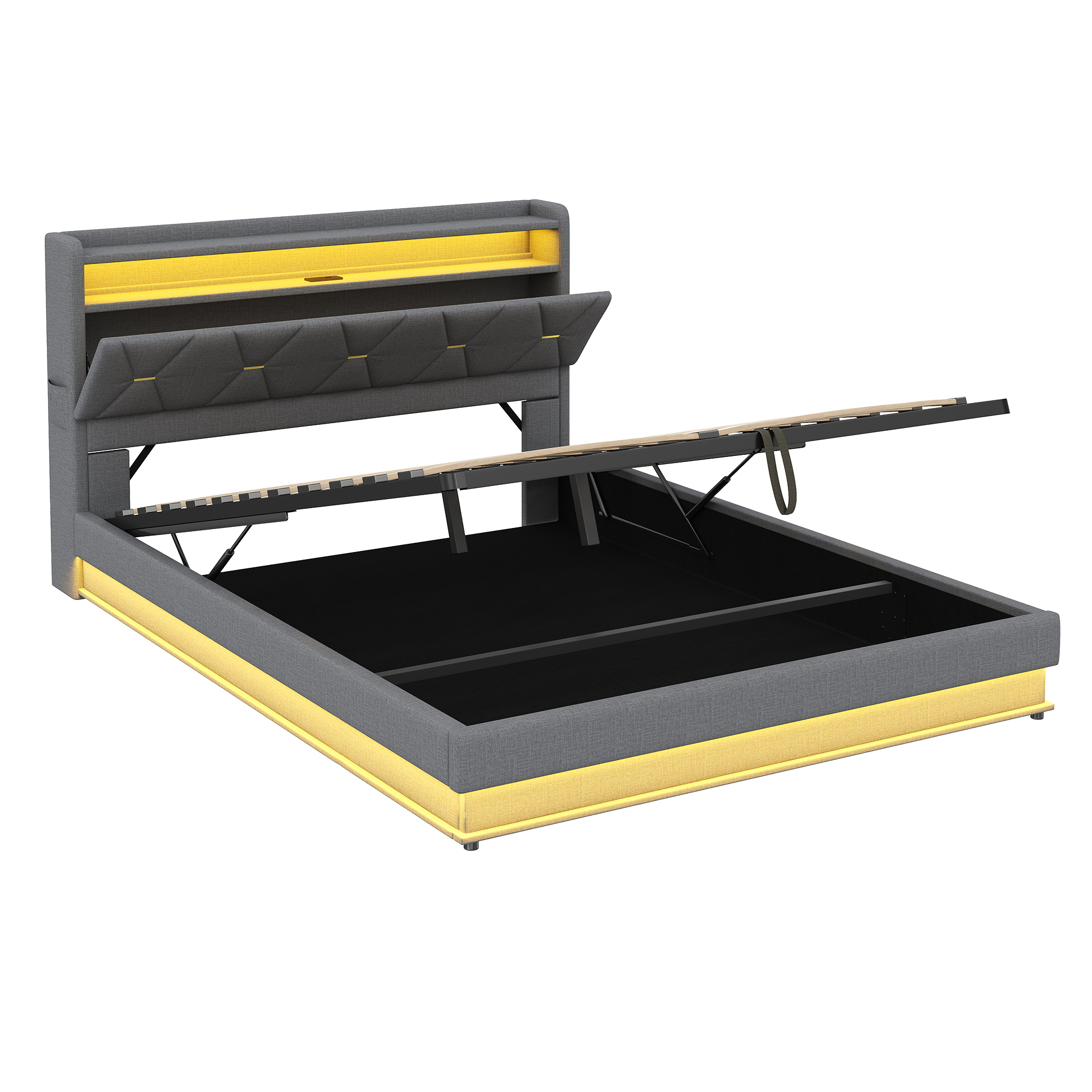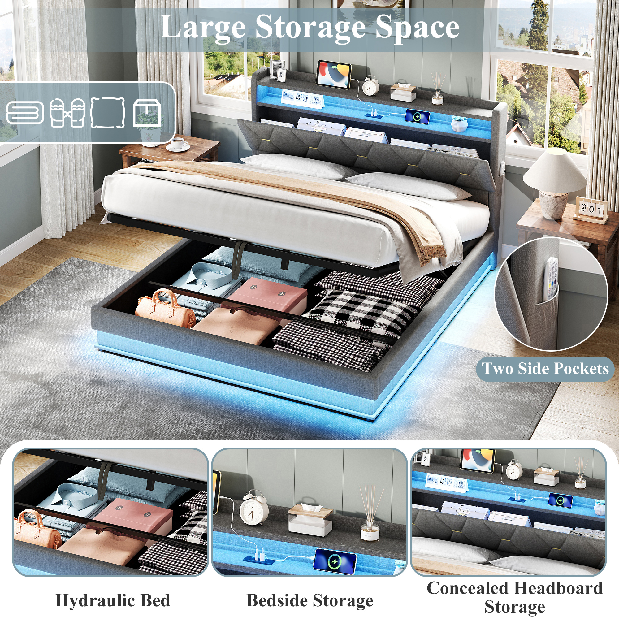 Product Name:5ft King Upholstered Bed Frame with Hydraulic Storage, LED Headboard with Charging Station and Concealed Headboard Storage, USB and Type - C Ports, Linen, No Box Spring Needed, Grey (No Mattress)