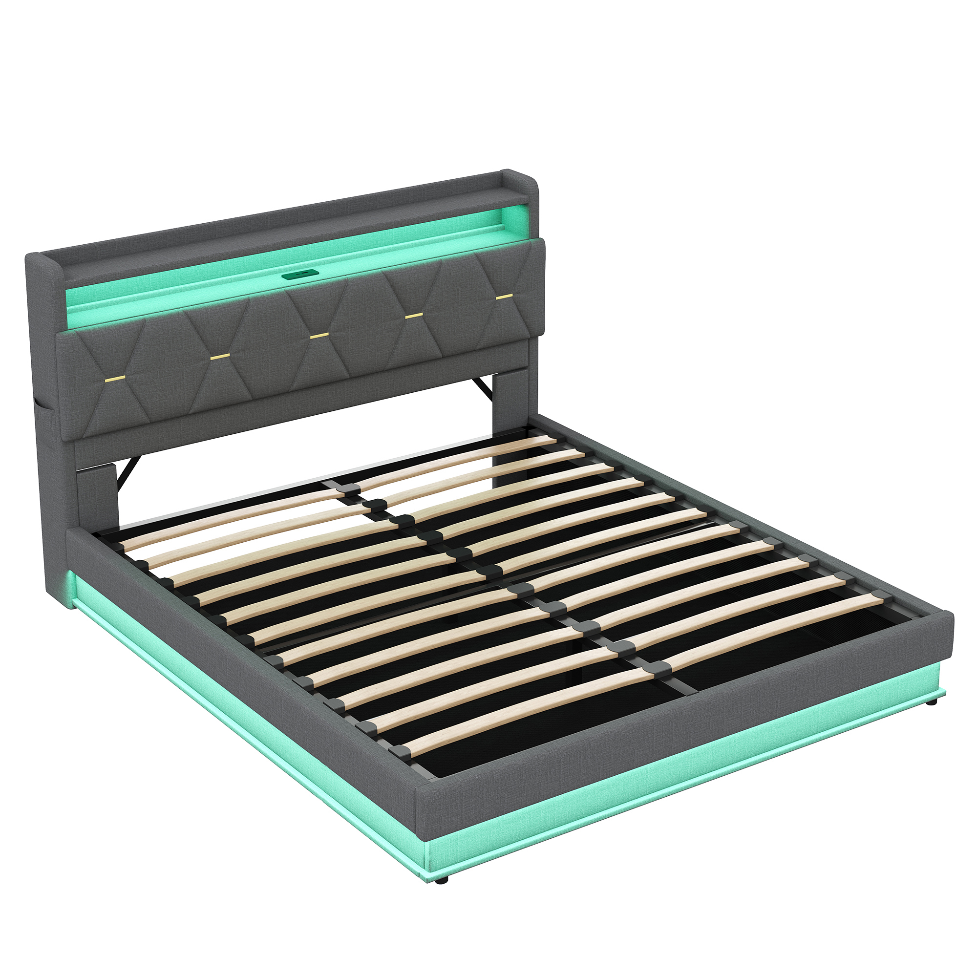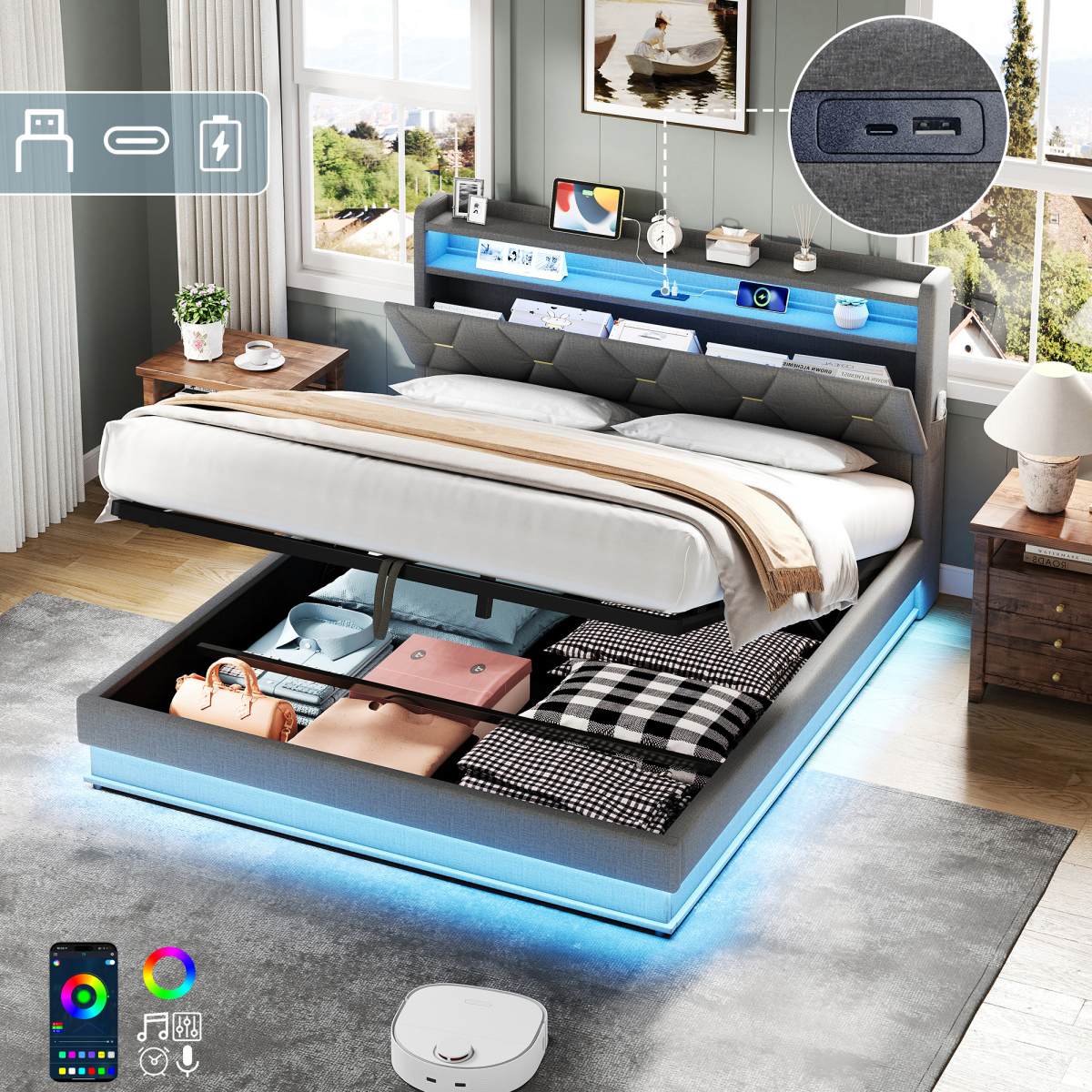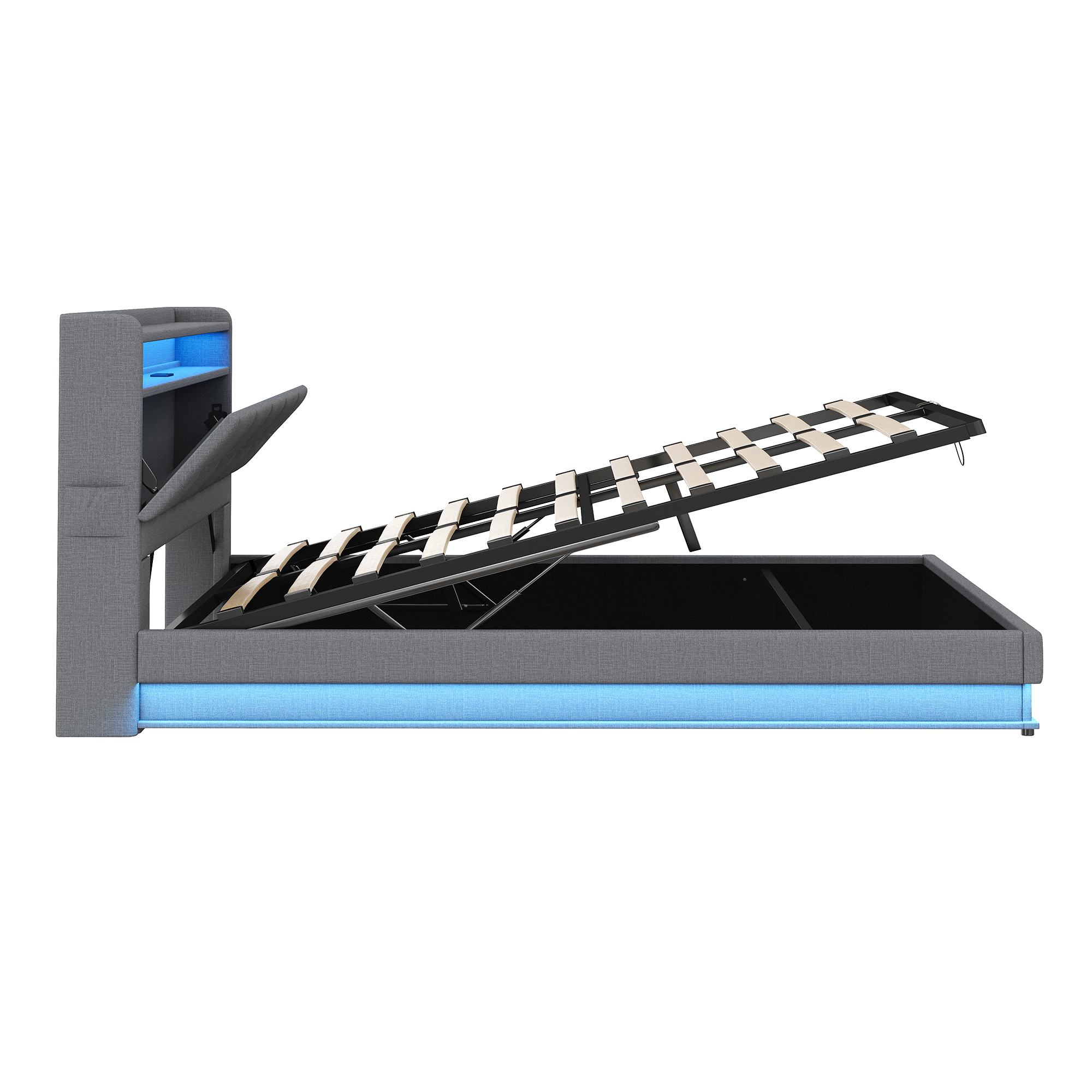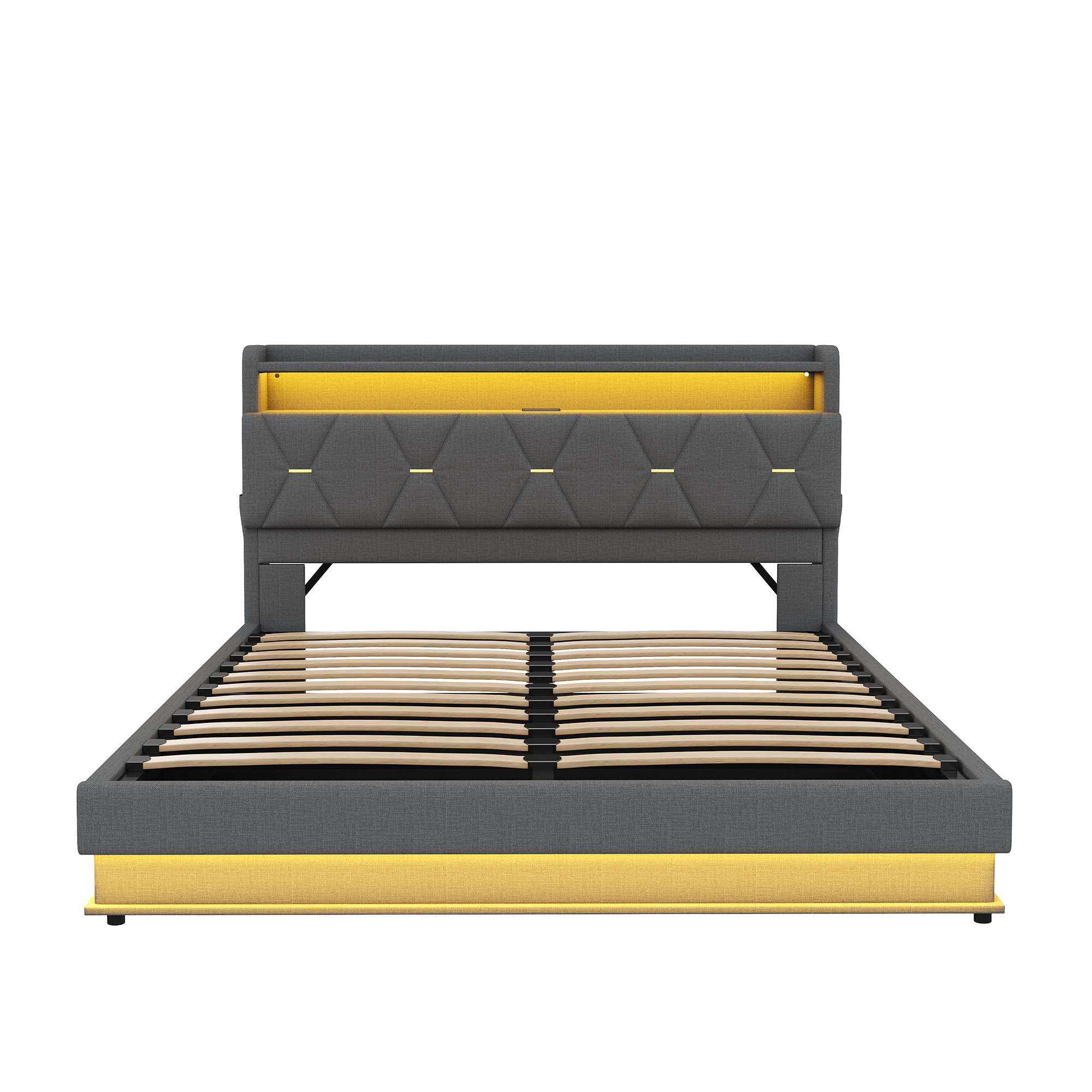 Product Name:5ft King Upholstered Bed Frame with Hydraulic Storage, LED Headboard with Charging Station and Concealed Headboard Storage, USB and Type - C Ports, Linen, No Box Spring Needed, Grey (No Mattress)