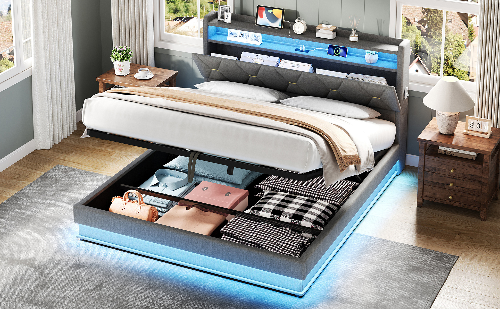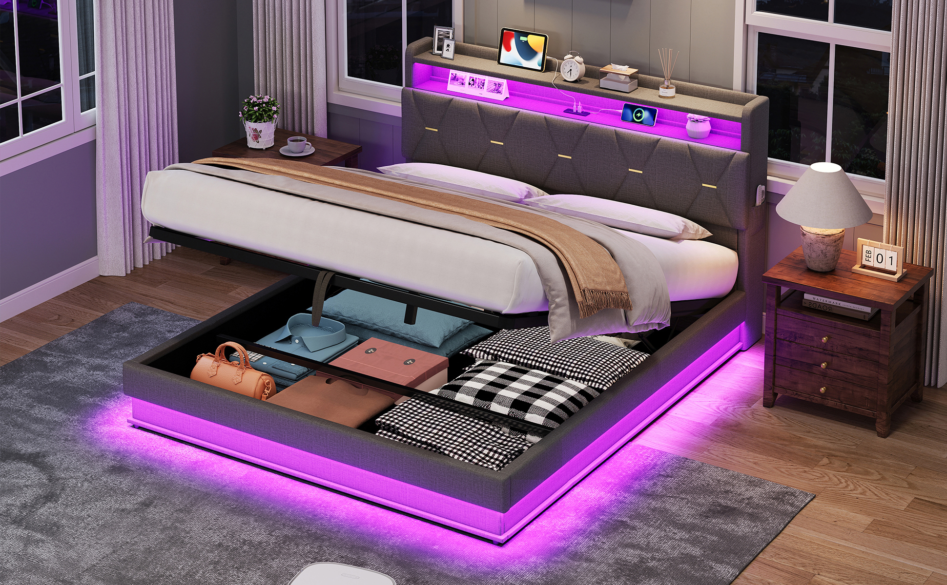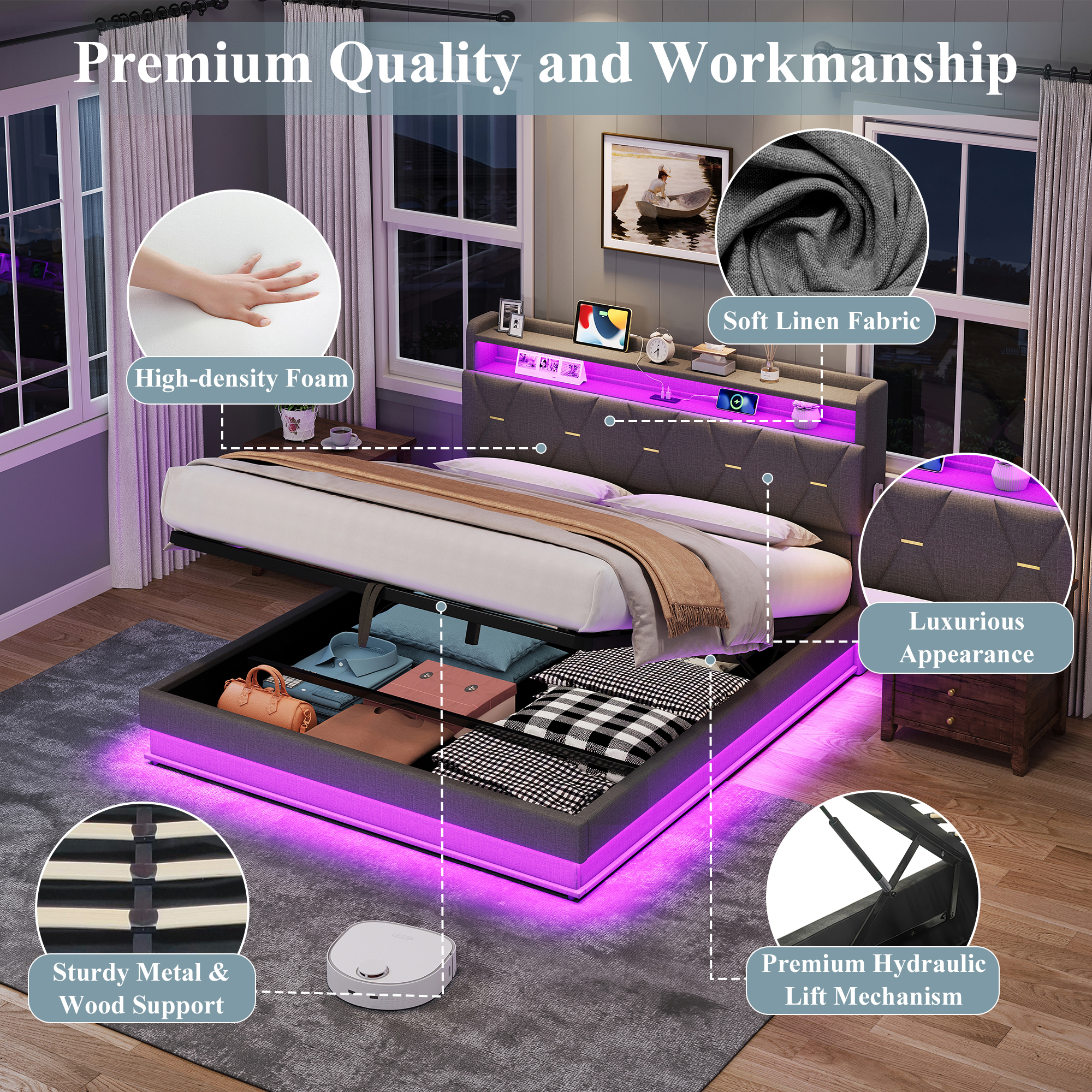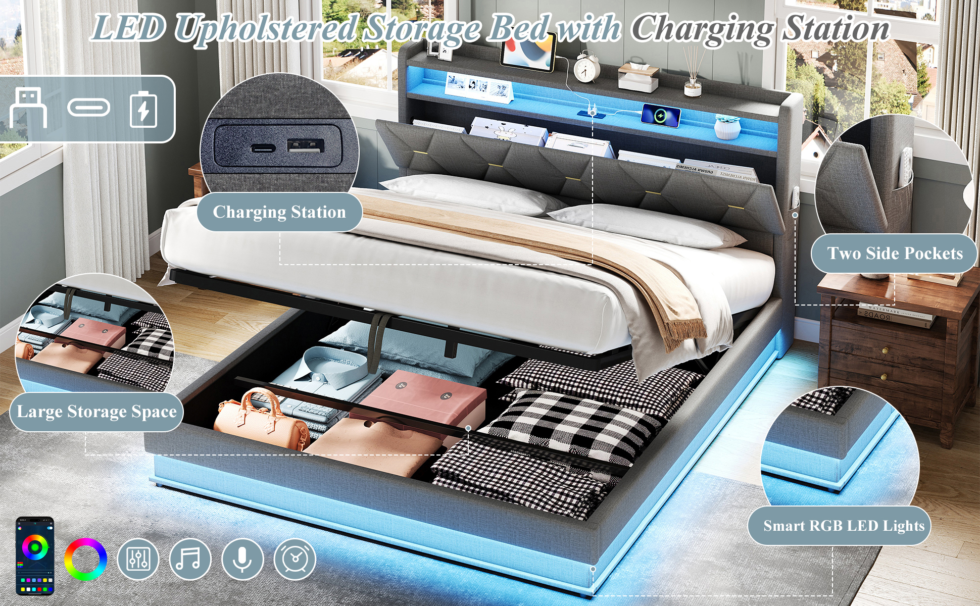 Product Name:5ft King Upholstered Bed Frame with Hydraulic Storage, LED Headboard with Charging Station and Concealed Headboard Storage, USB and Type - C Ports, Linen, No Box Spring Needed, Grey (No Mattress)