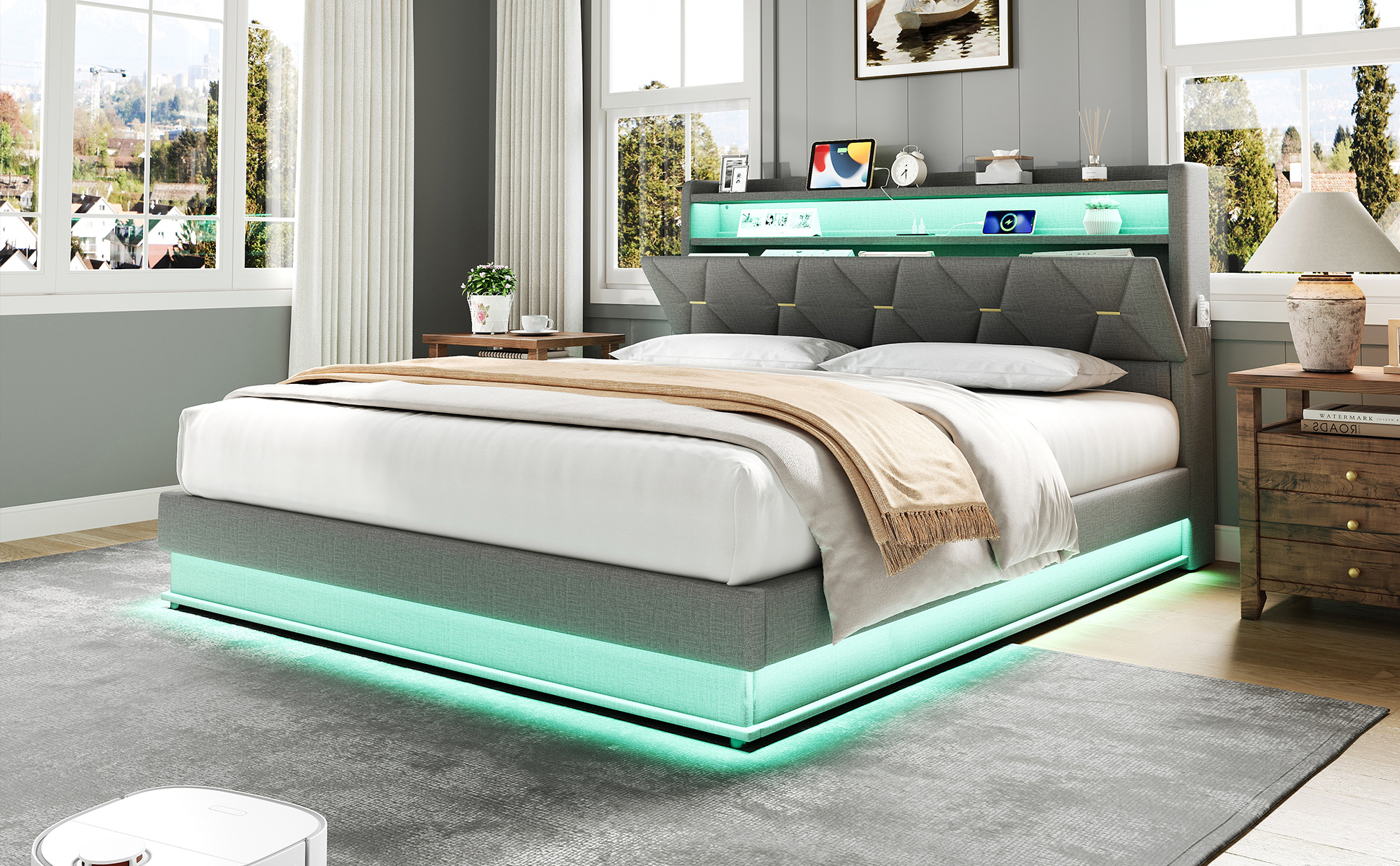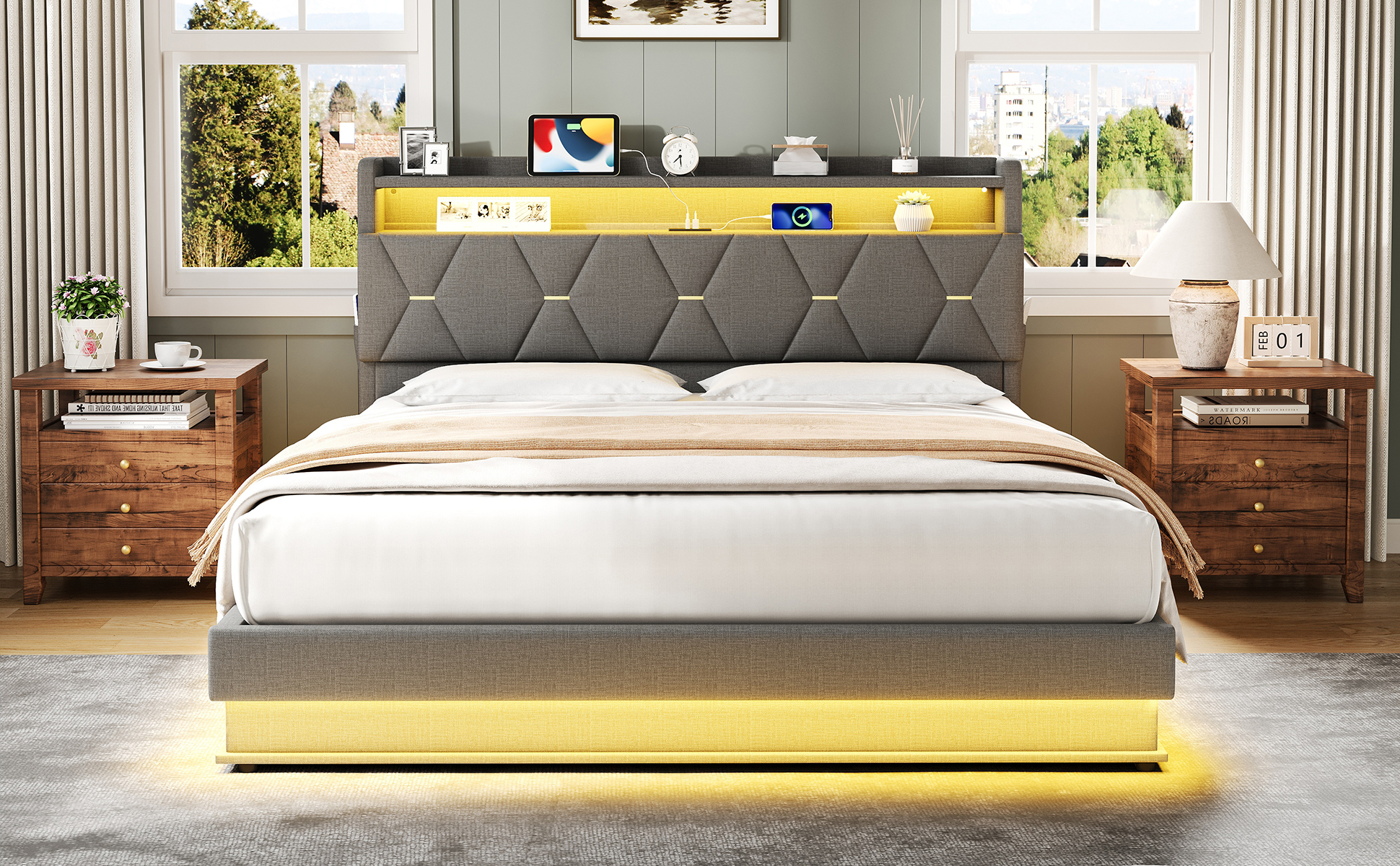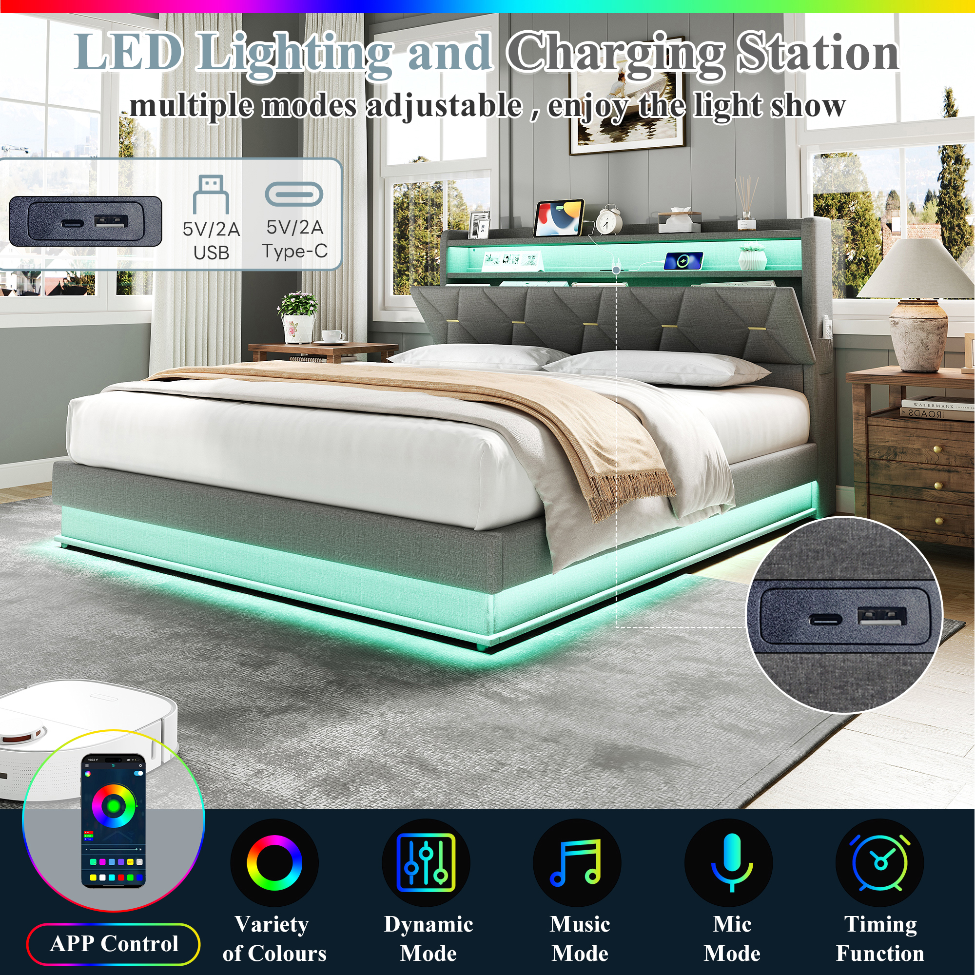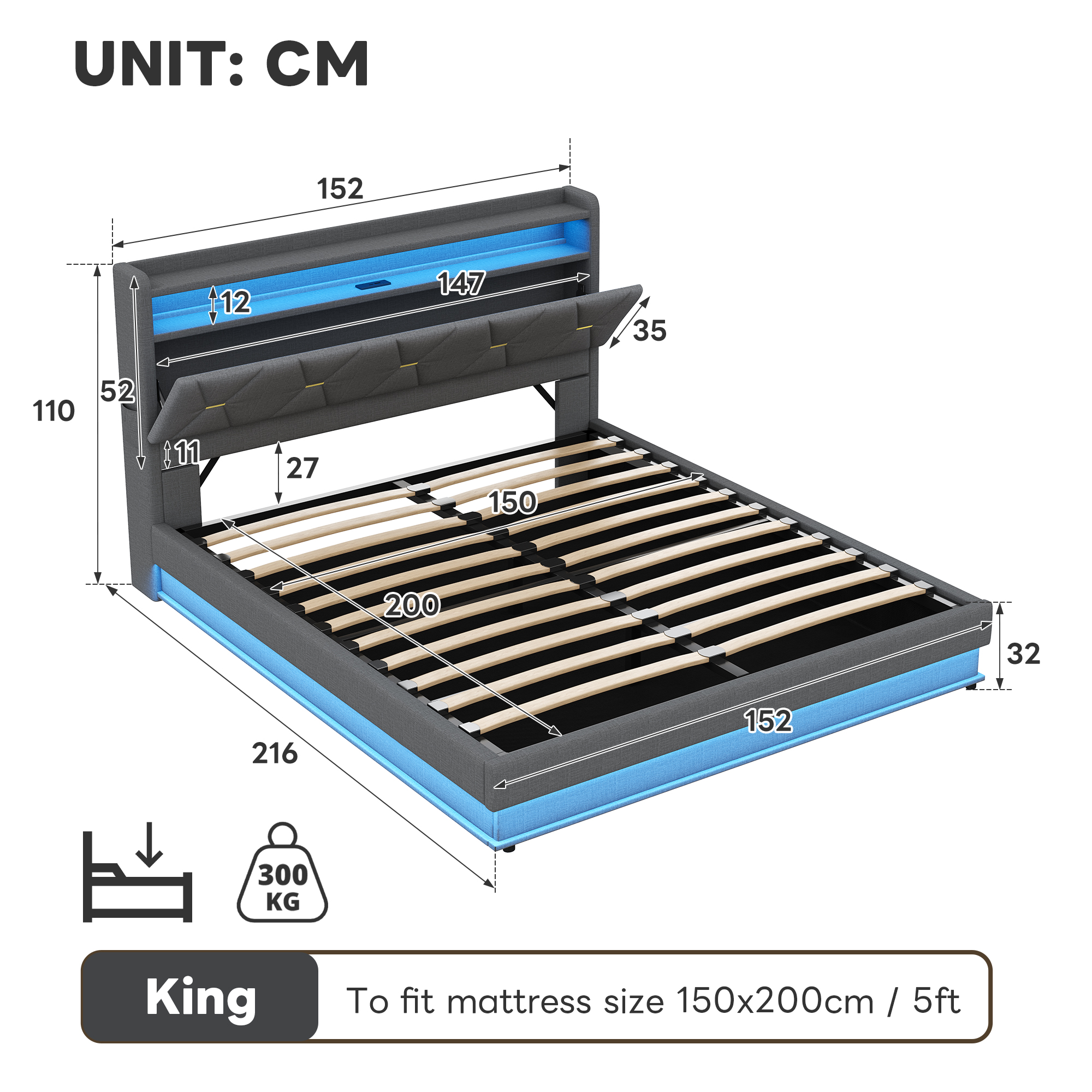 Product Name:5ft King Upholstered Bed Frame with Hydraulic Storage, LED Headboard with Charging Station and Concealed Headboard Storage, USB and Type - C Ports, Linen, No Box Spring Needed, Grey (No Mattress)