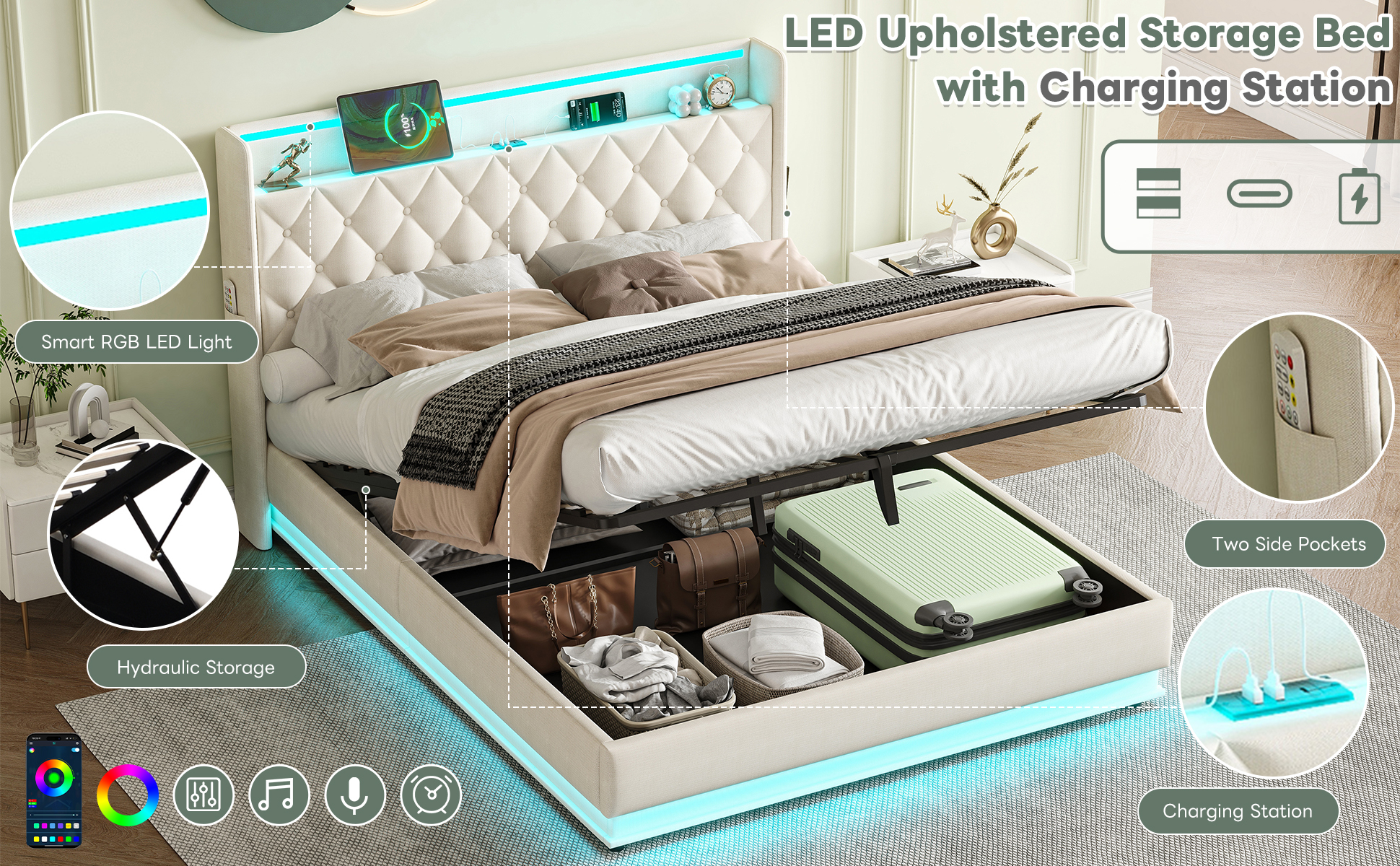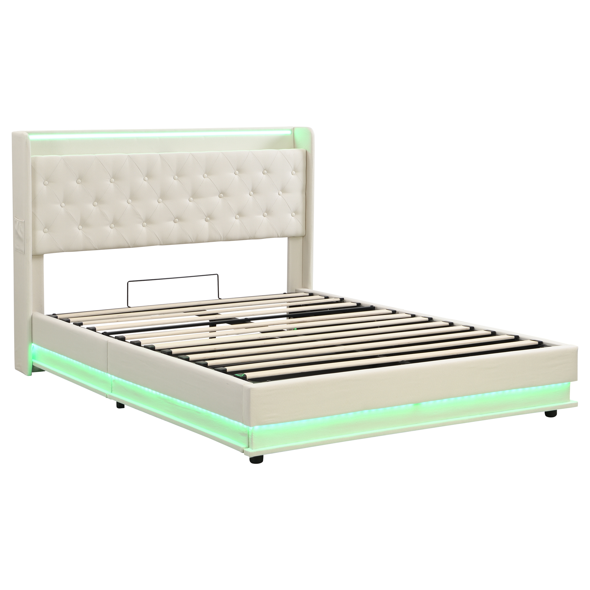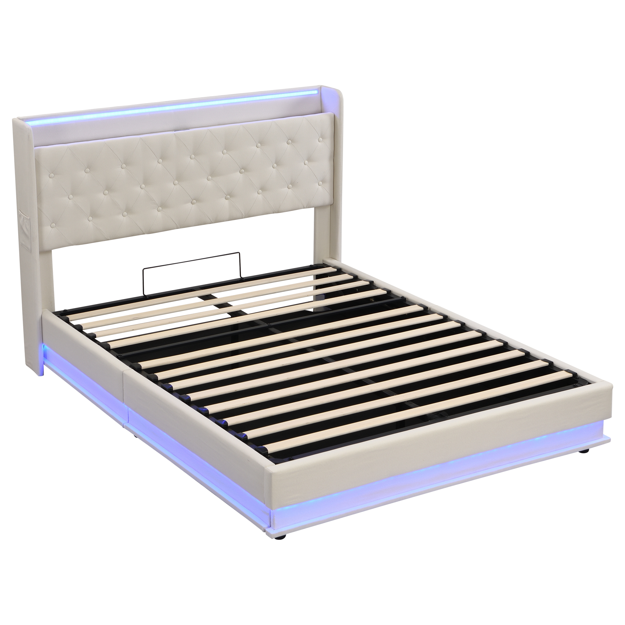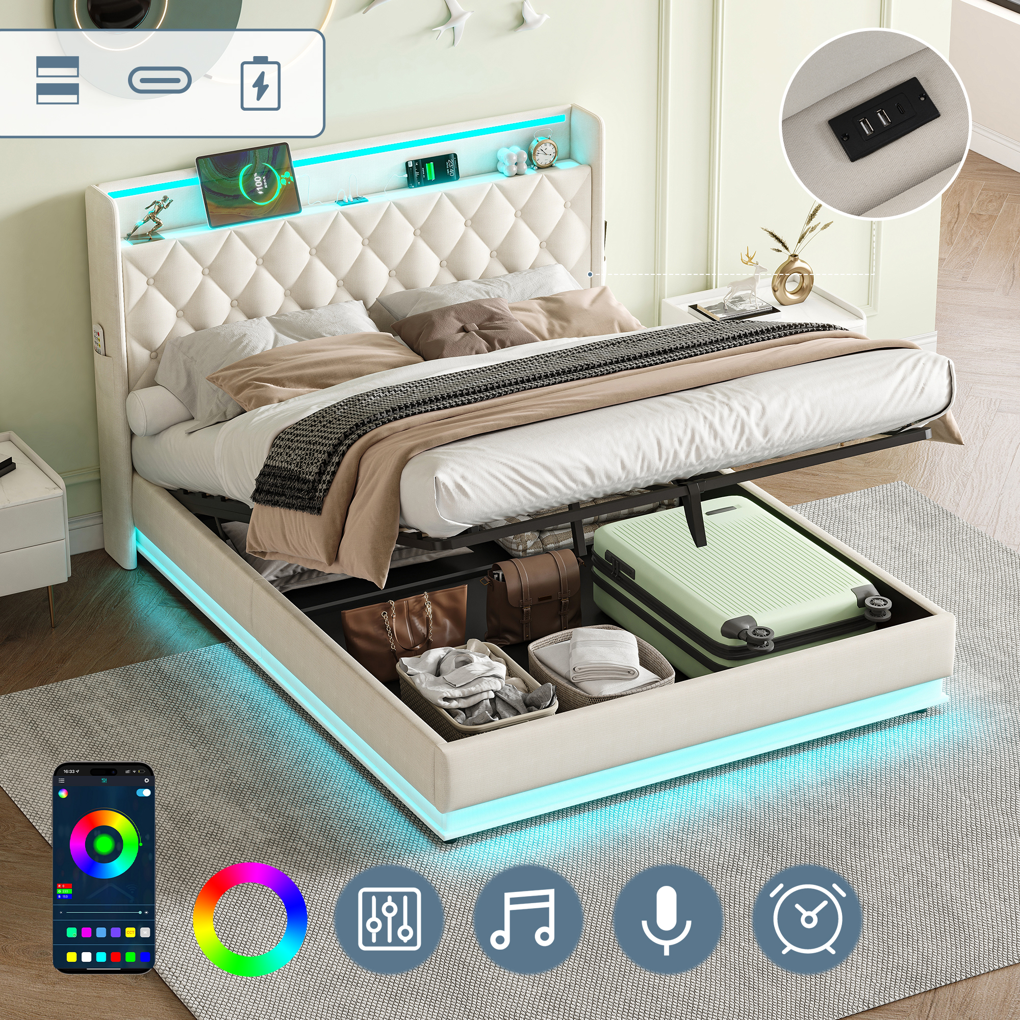 Product Name:5ft King Upholstered Bed Frame with Hydraulic Storage, Linen Ottoman Bed with LED Lighting and Charging Station, LED Button Tufted Headboard with USB and Type - C Ports, No Box Spring Needed, Beige