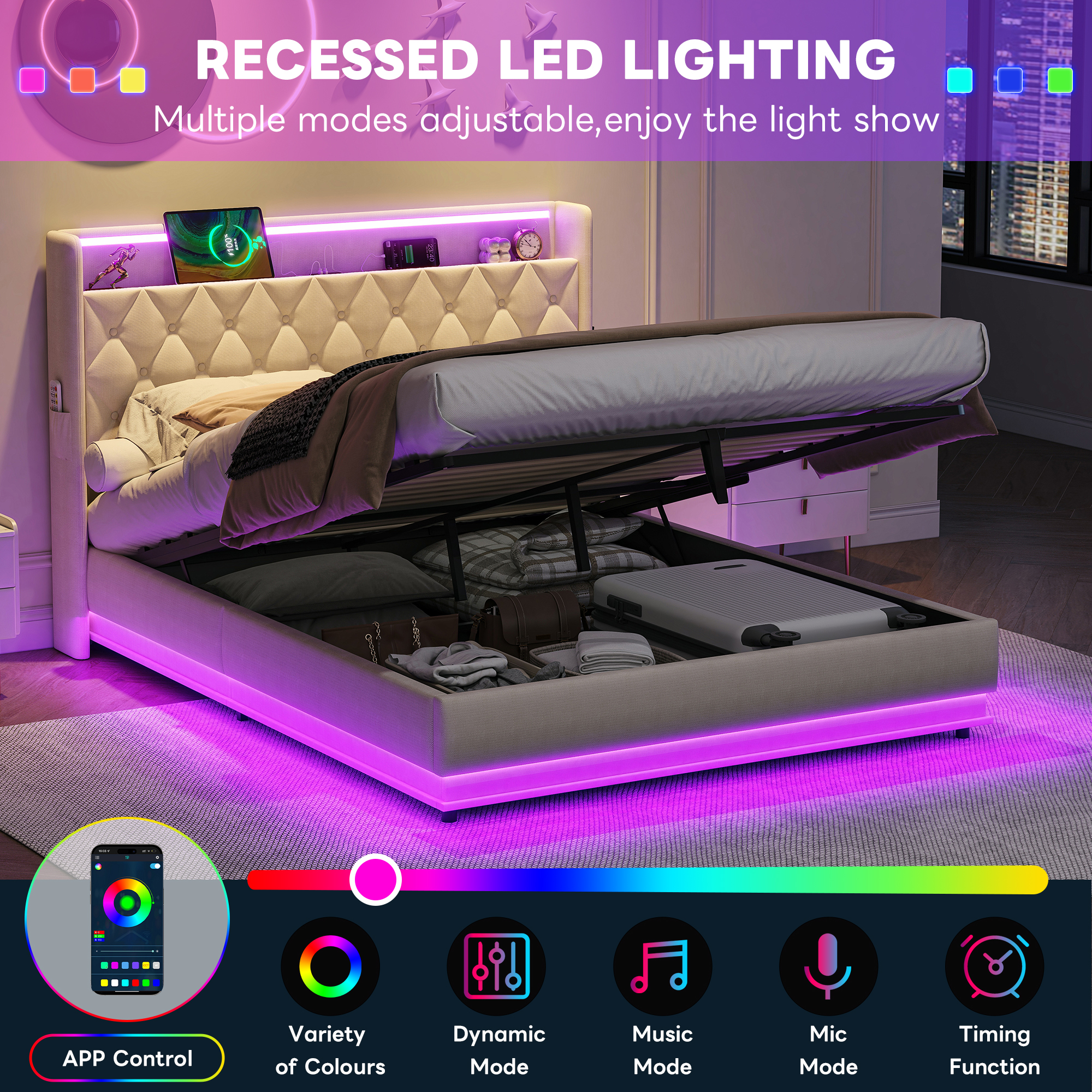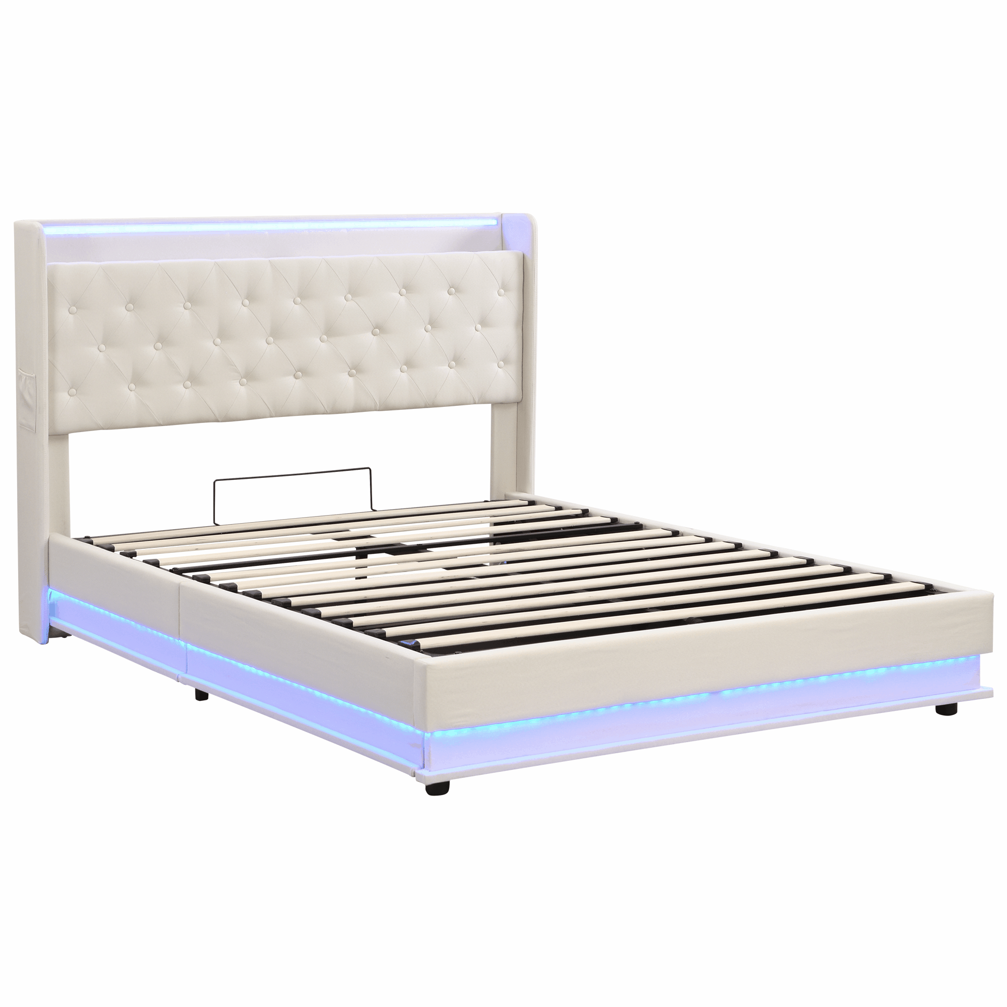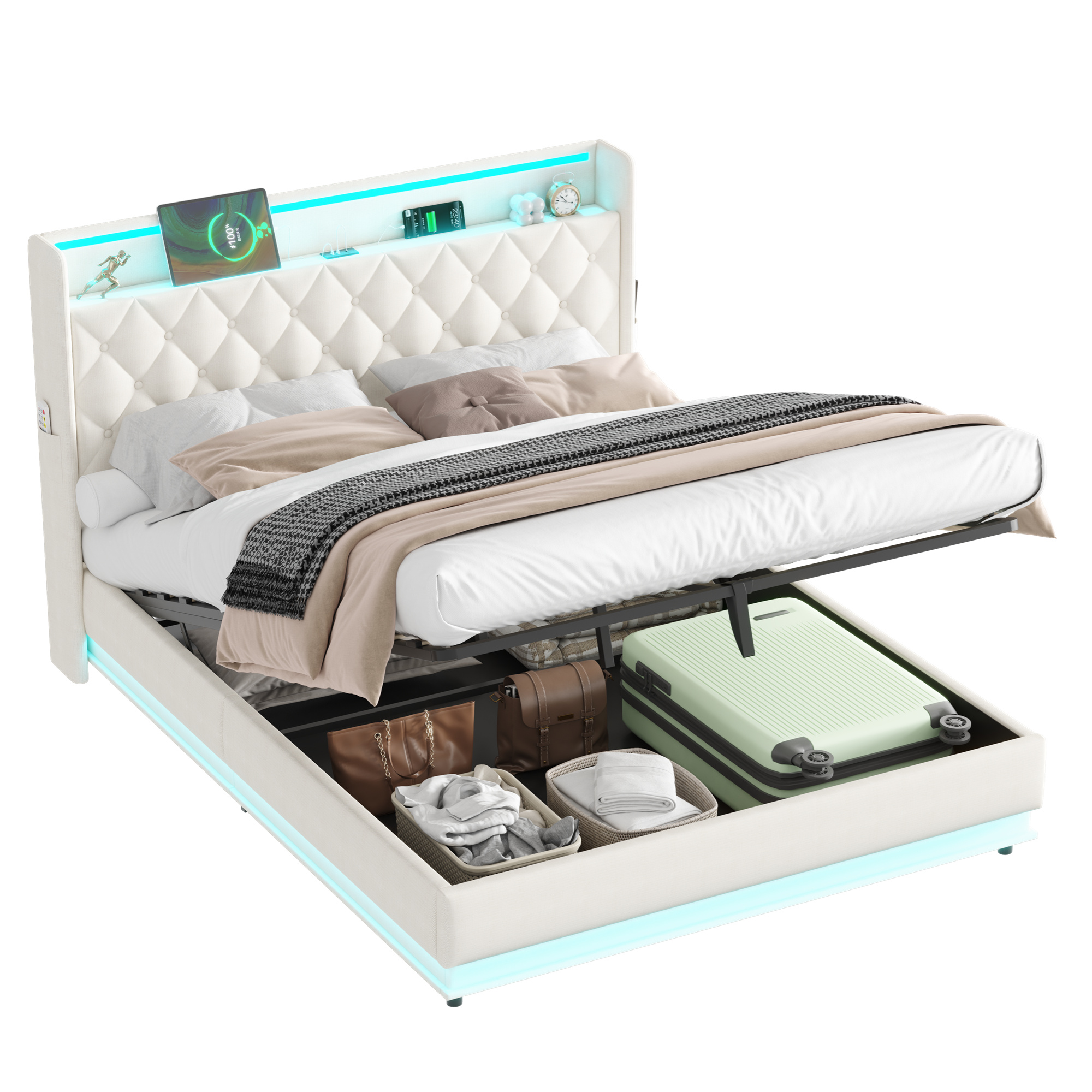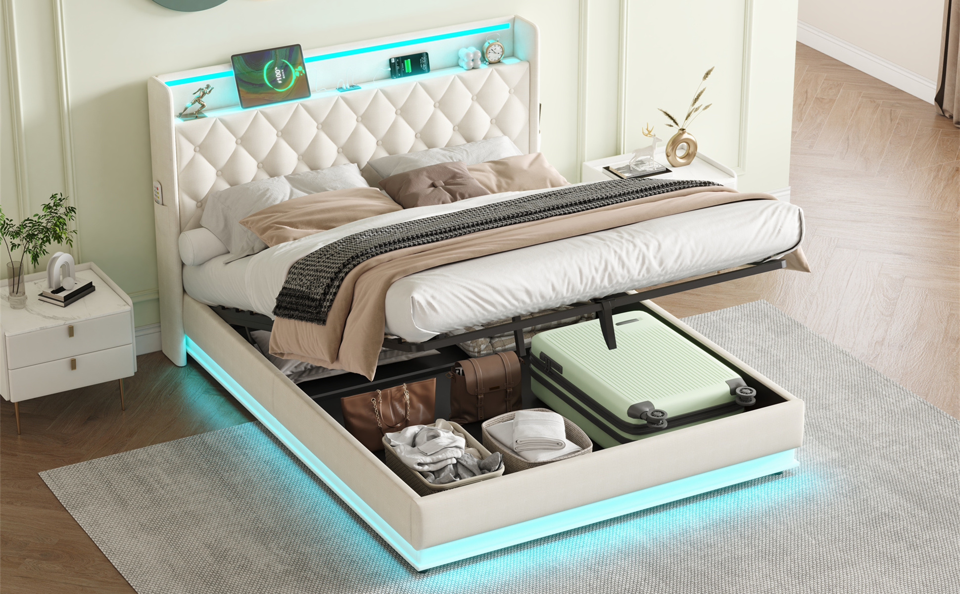 Product Name:5ft King Upholstered Bed Frame with Hydraulic Storage, Linen Ottoman Bed with LED Lighting and Charging Station, LED Button Tufted Headboard with USB and Type - C Ports, No Box Spring Needed, Beige